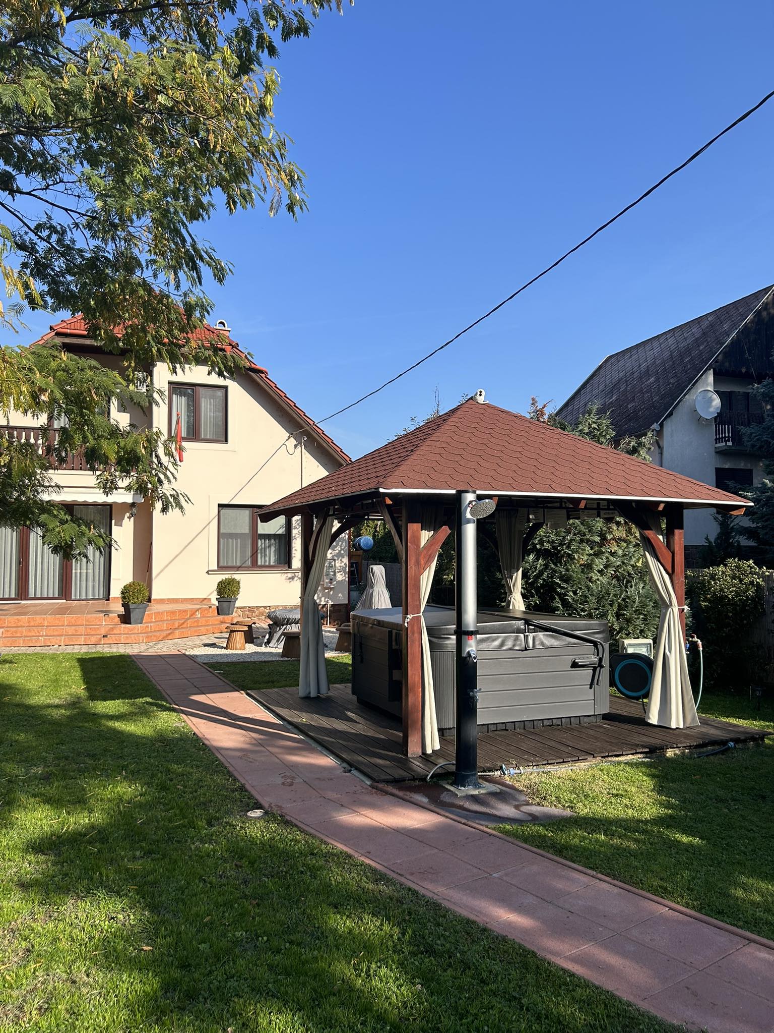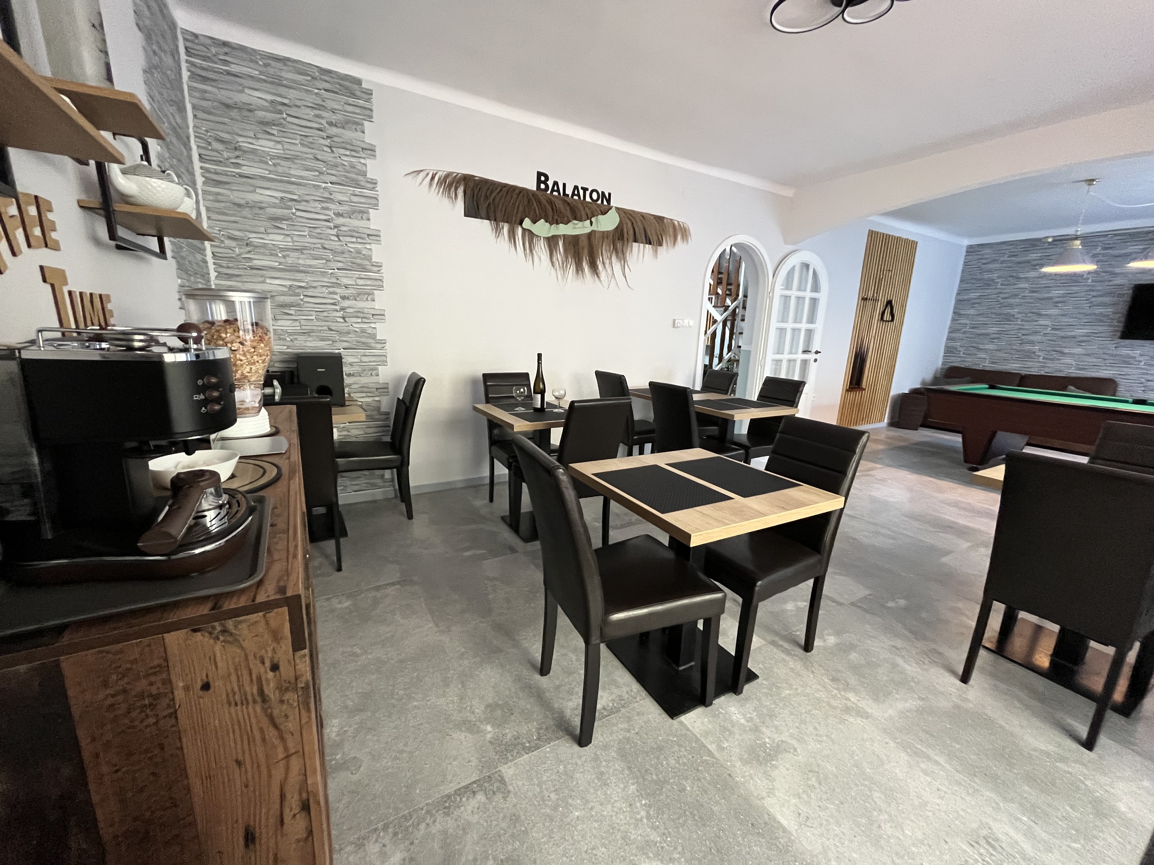 Szálláshelyünk 6 szobával és 3 fürdőszobával rendelkezik. Férőhelyek száma 14 + 1 fő, szükség esetén tudunk biztosítani utazó gyerekágyat is. 4 db 2 személyes és 2 db 3 személyes szobánk van. A ház ideális családoknak, baráti társaságoknak ahol minden adott a közös szórakozásra és a nyári hónapokban külön-külön is foglalhatóak a szobák akár 1 éjszakára is. Szobáink felszereltsége, wifi, légkondi, okos tv, törölköző, köntös, ágynemű, tusfürdő. Szolgáltatásunk wifi 5 G, légkondi, okos tv, konyha- étkező teljes felszereléssel, biliárd, karaoke szett, tollas, pingpong, társasjátékok, kinti függönnyel körbekerített 7 személyes Jakuzzi, 6 fős Finn Szauna, grill terasz, bogrács, tüzifa, nyársbotok, ásványvíz bekészítés a szobákban és az étkezőben, kávé, tea, bekészítés az étkezőben, belső parkoló max 6 autó részére. Strandszezonban kedvezményes Révfülöp kártyát biztosítunk amivel fél áron lehet a strandok területére bemenni és több 10% -os kedvezményt is igénybe lehet vele venni.