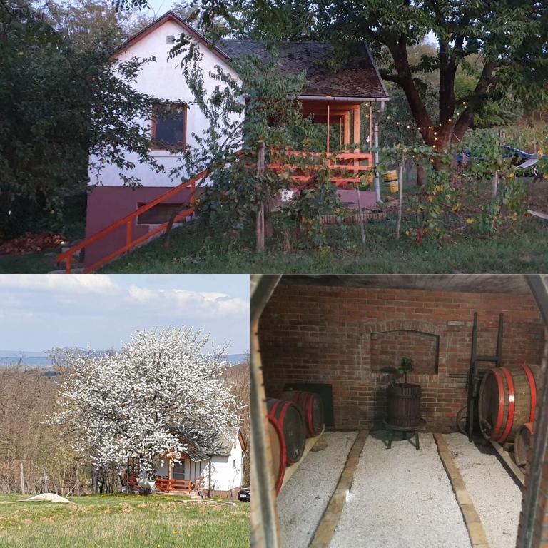 ​A hatalmas és gyönyörű cseresznyefa ad árnyékot a terasznak. A kertben bográcsozó, sütögetős sziget is kialakításra került, illetve a kert végében egy Badacsonyra panorámás kiülő és fűthető dézsafürdő várja a vendégeket.