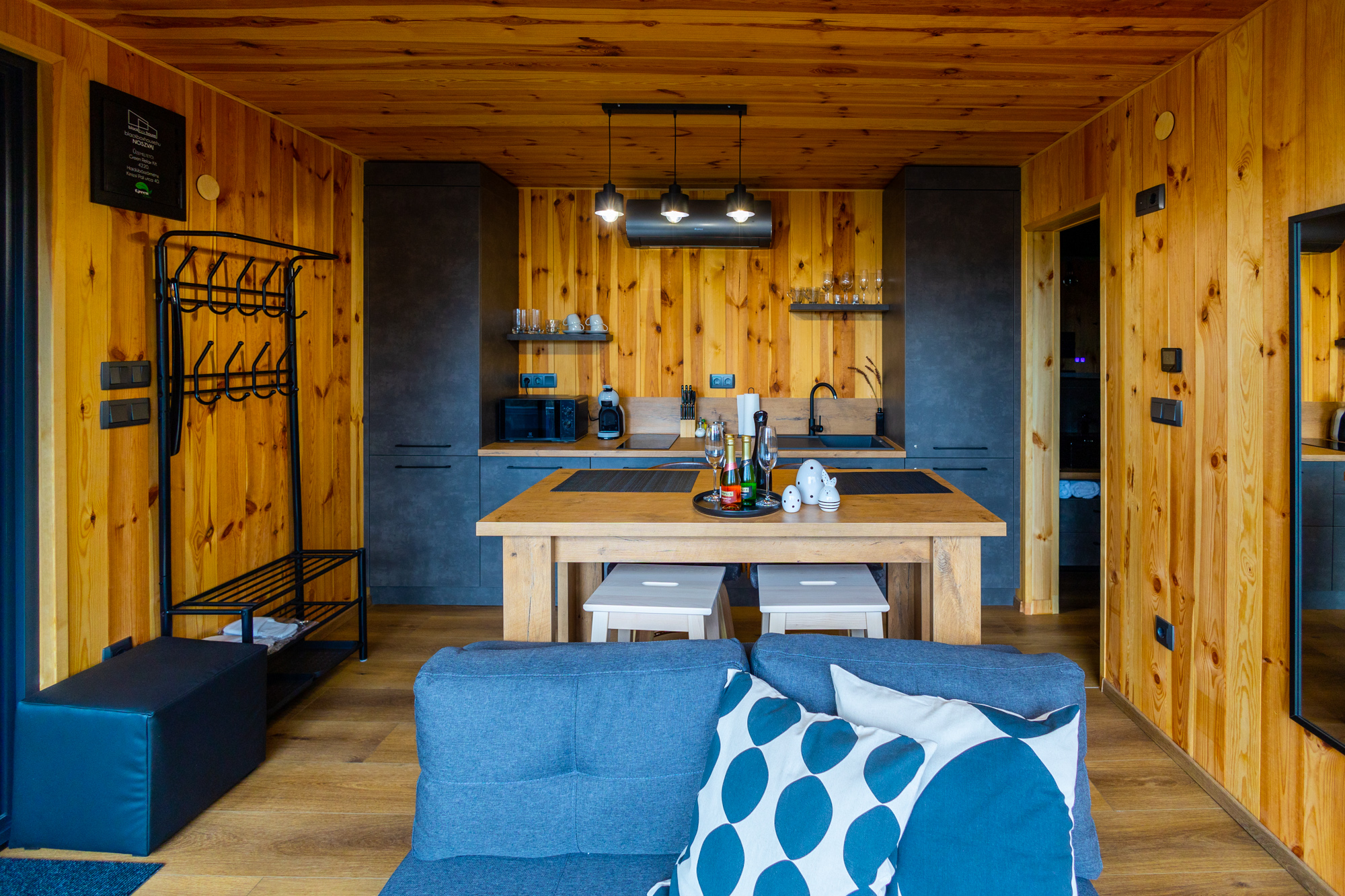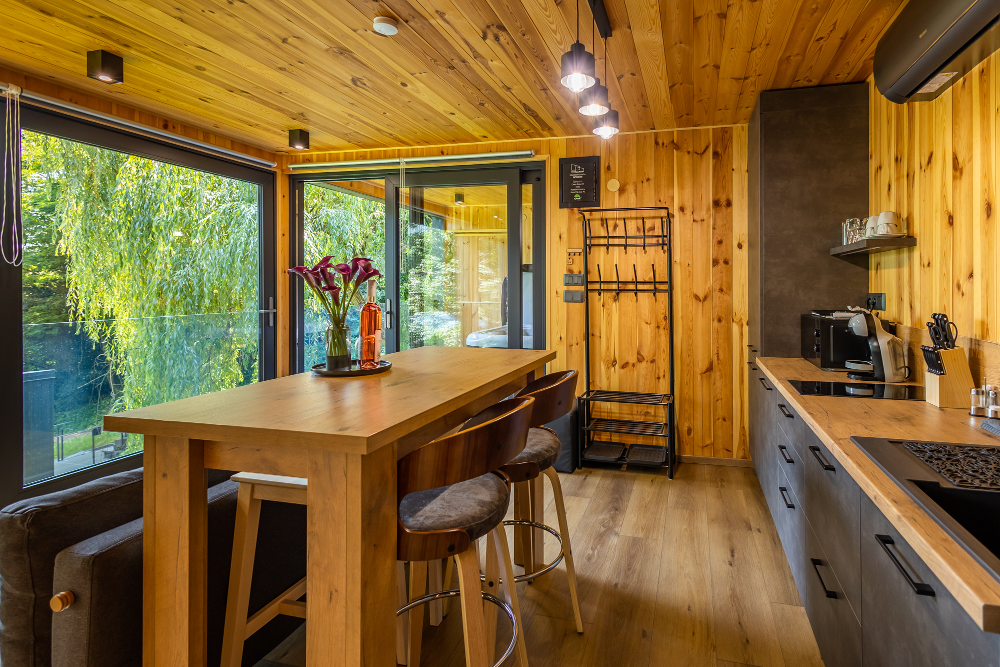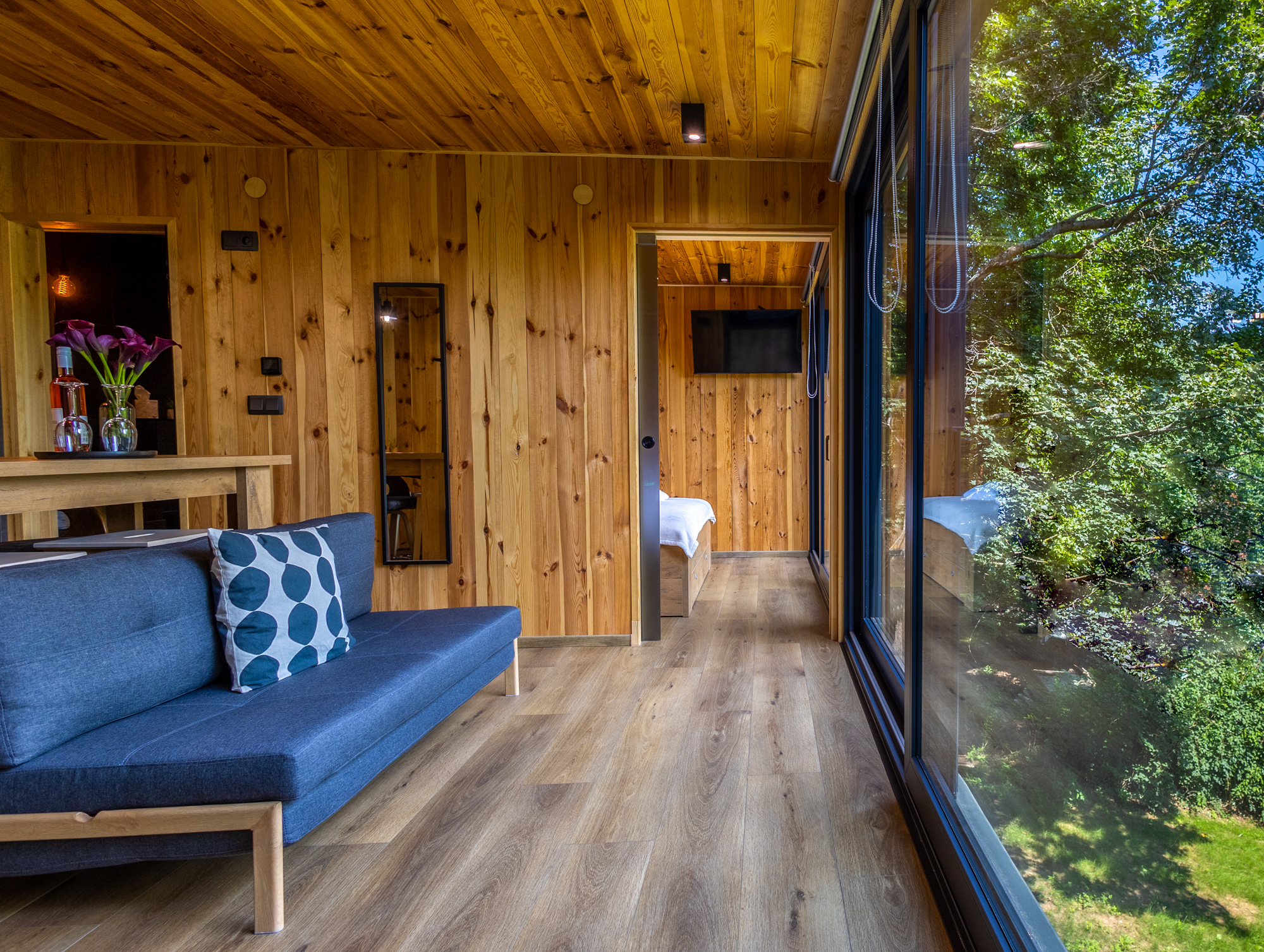 A nappali padlótól plafonig érő üvegfalai csodás panorámával örvendeztetnek meg. Faburkolatú hálóterében a hatalmas (180 x 200 cm-es) franciaágyból fekve nézheted a naplementét – vagy a filmcsatornák kínálatát. Intim fekete fürdőnk 2 személy számára is kényelmes. A frissítő zuhany után páramentesítővel ellátott tükörben nézegetheted kisimult vonásaidat.
