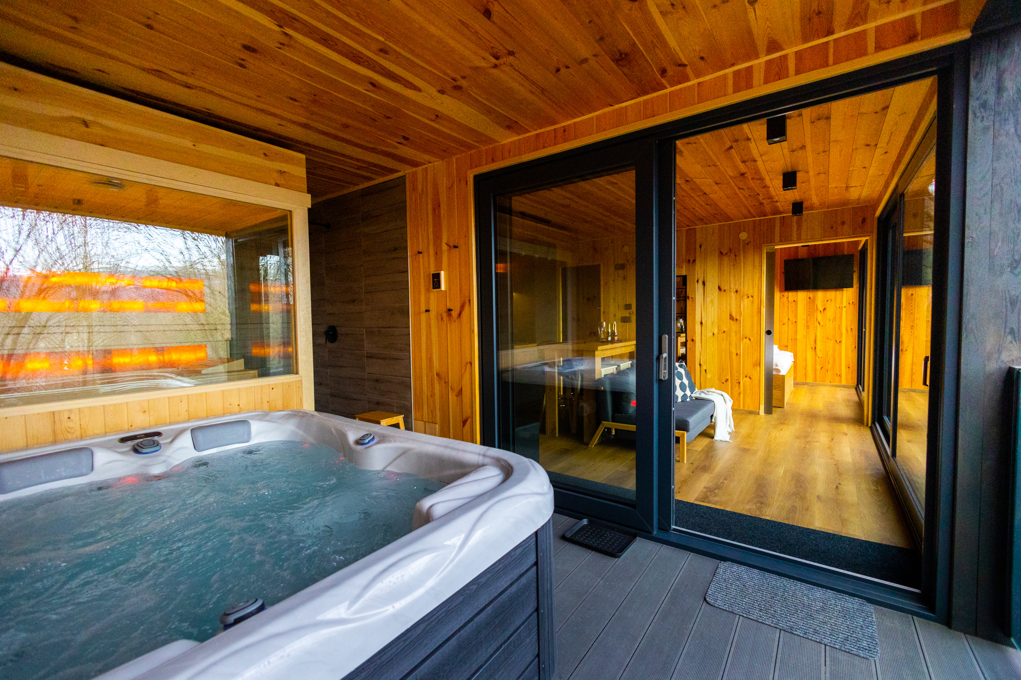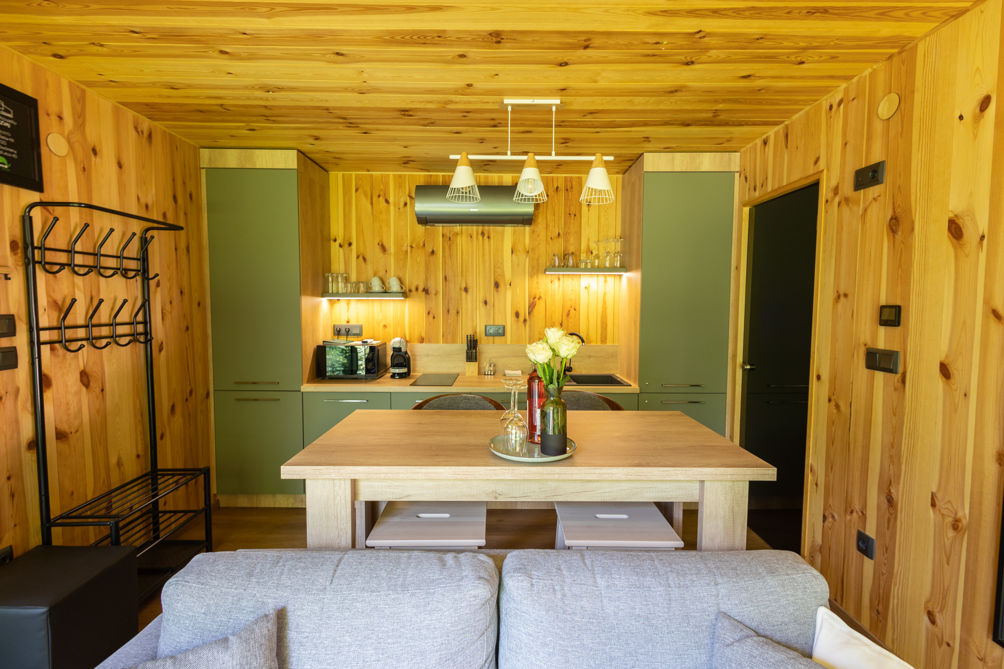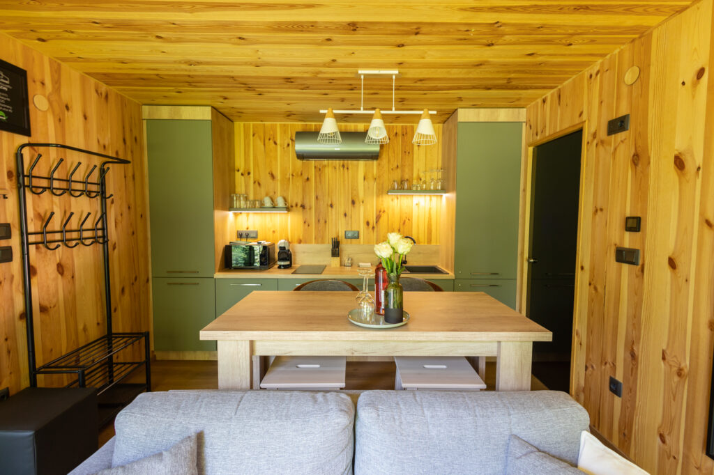 Prémium wellness vendégházunk pestozöld – világosszürke – fehér helyiségei teret adnak a páros együttlét változatos formáinak a semmittevéstől minden spontán ötletig.A minimál-ékszerdobozban elegáns bárpult várja a meghitt esti koccintásokat és süppedős kanapé az összebújós beszélgetéseket.