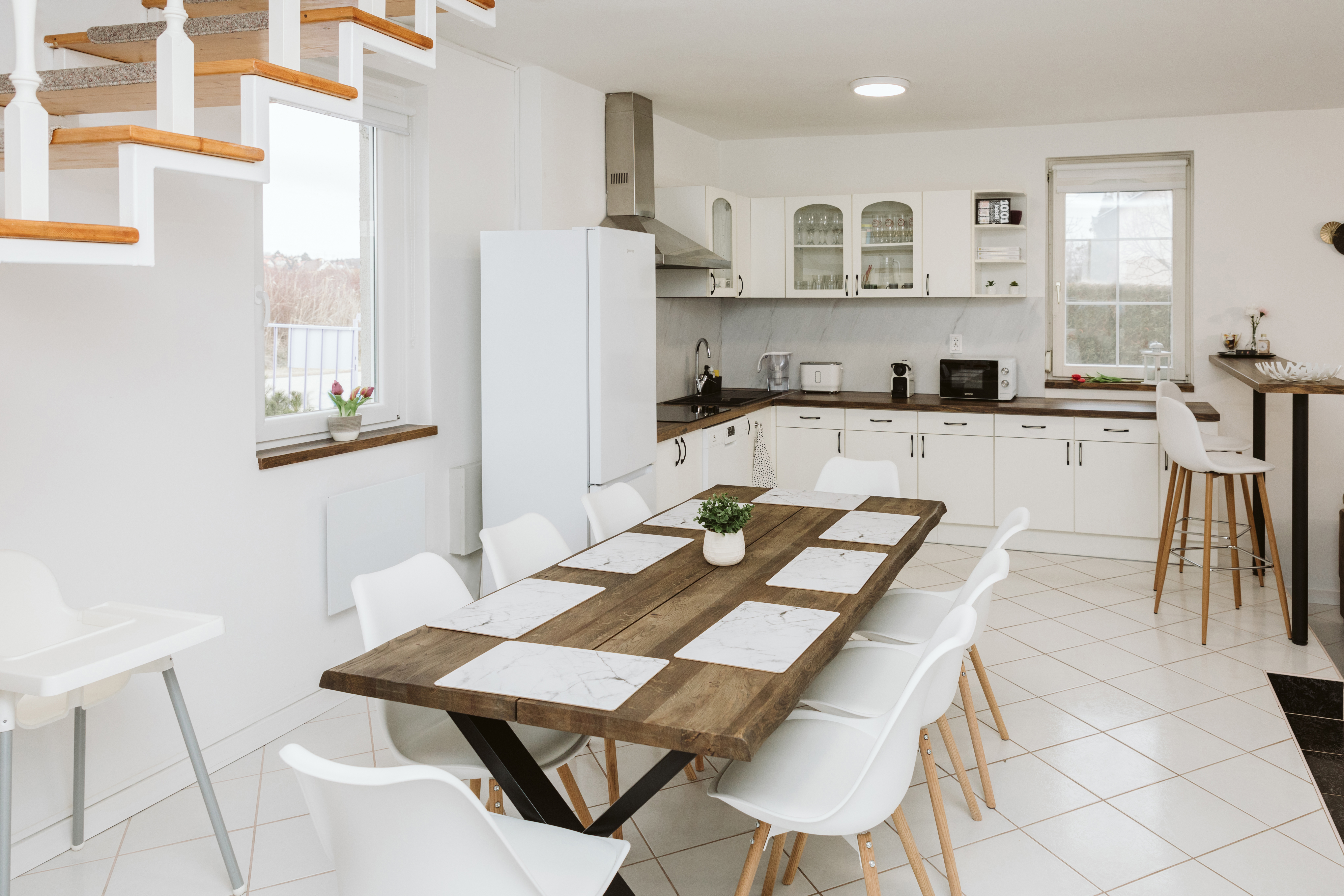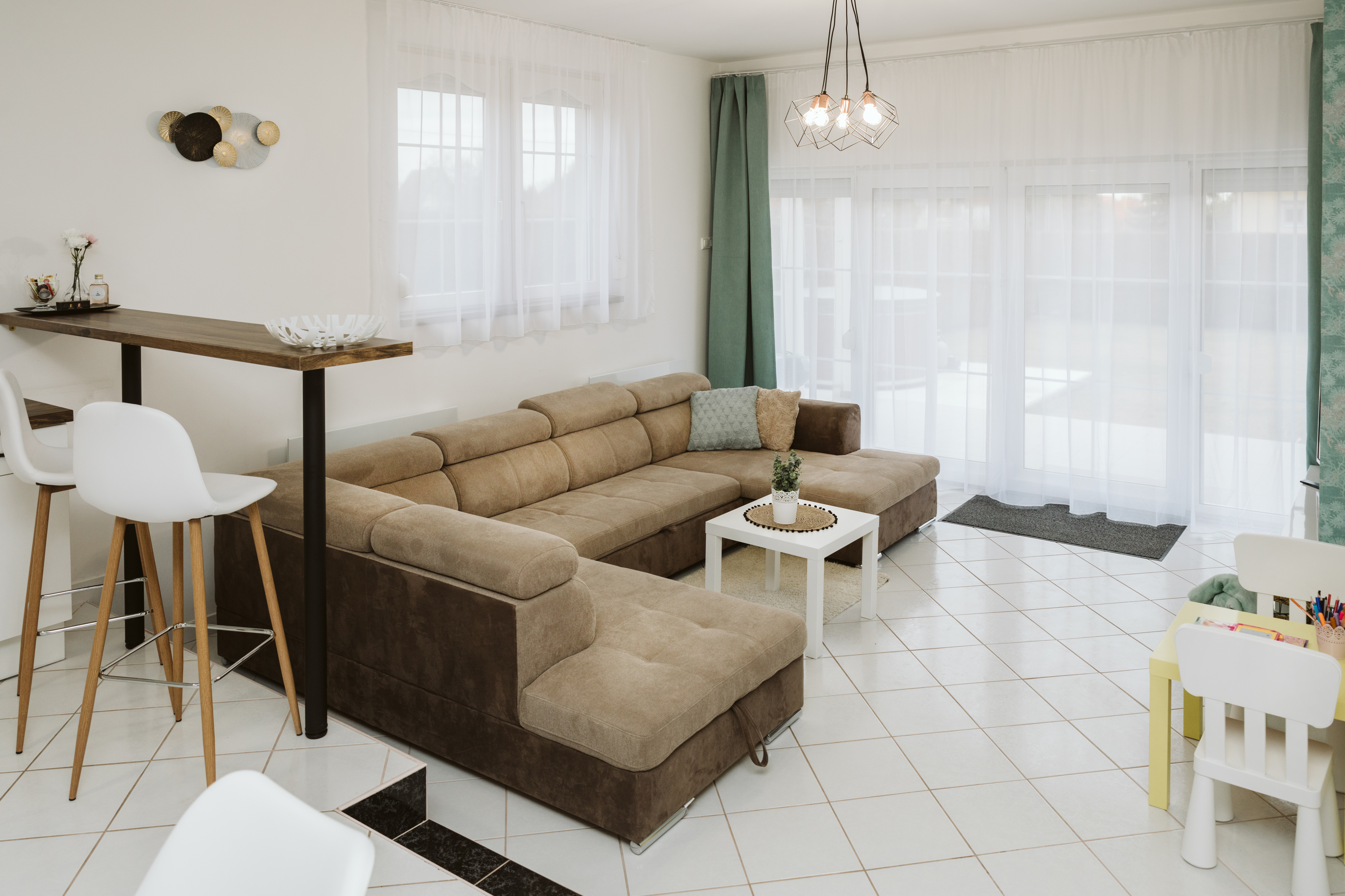 Tágas nappalival, étkezővel, remekül felszerelt konyhával várjuk vendégeinket, amely akár 8-10 fő elszállásolására is alkalmas. A négy hálószoba és két fürdőszoba mellett a ház előnye, hogy tágas közösségi terekkel rendelkezik. A szépen gondozott, parkosított kertben pedig fedett terasz szolgálja a vendégek kényelmét. Természetesen gondoltunk a legkisebbekre is, babaágy, babakád, etetőszék, gyereksarok és gyerekjátékok vár rájuk.