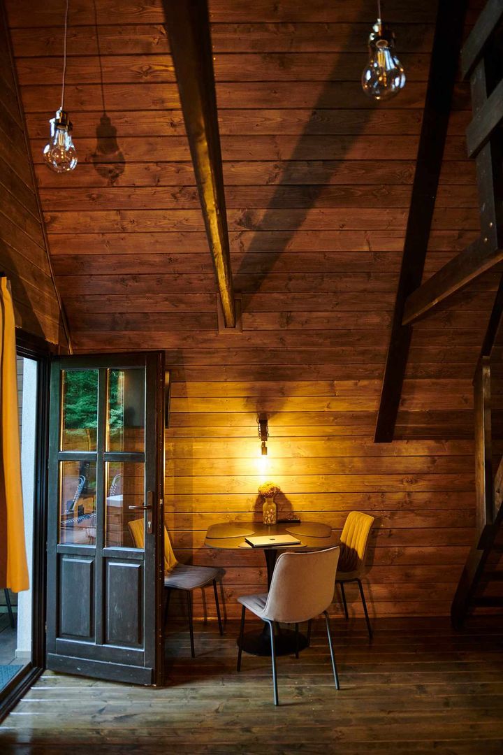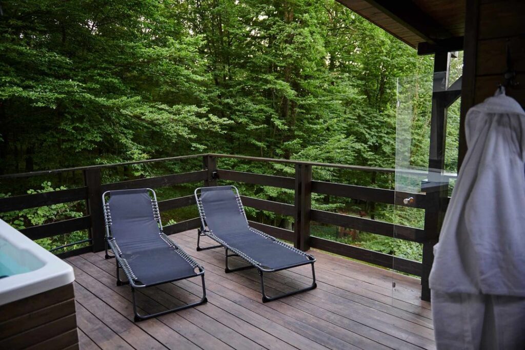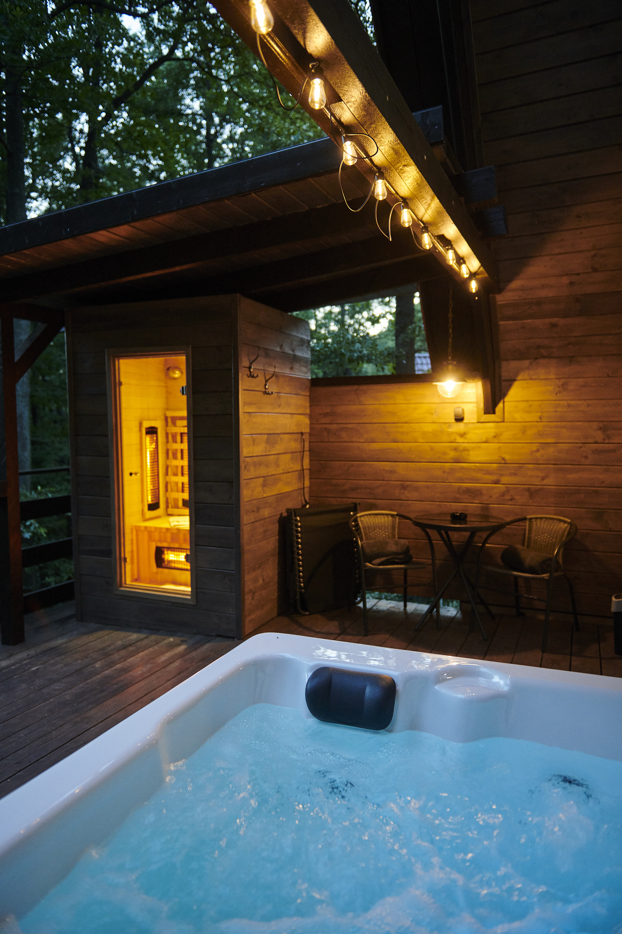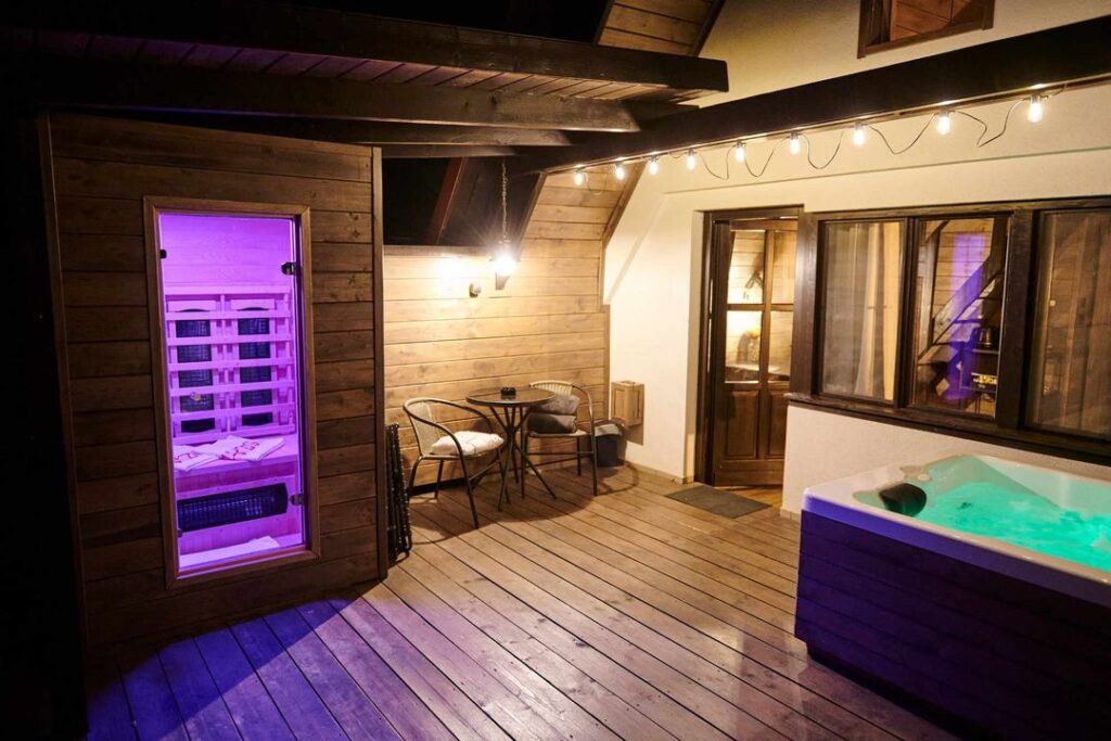 A közvetlen erdő szomszédságában lévő 2 személyes házikó 55m2-es, galériás, jakuzzival, szaunával felszerelt.