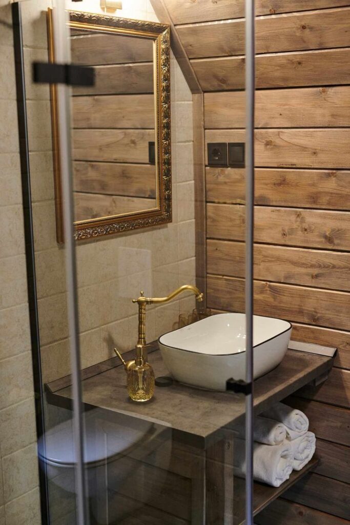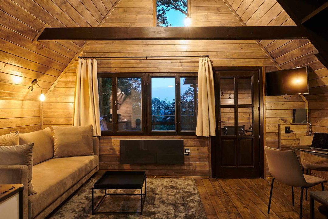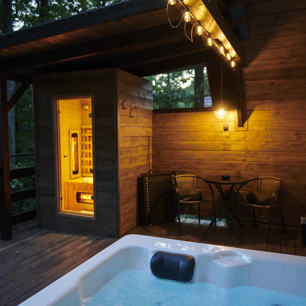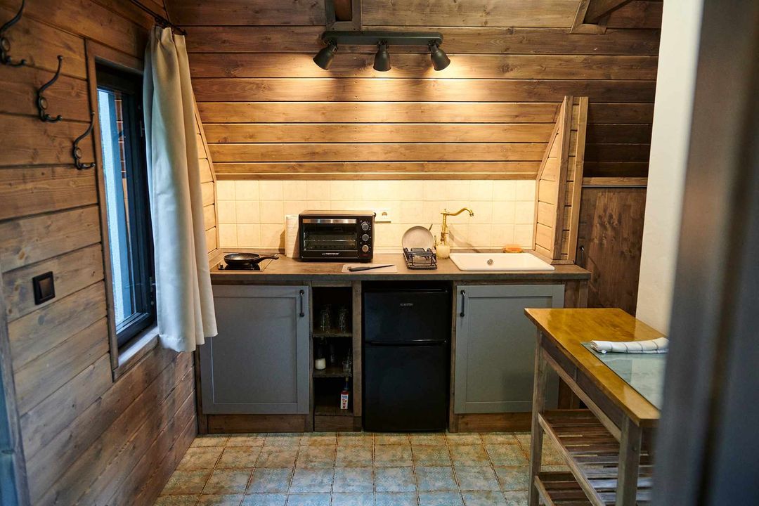 A közvetlen erdő szomszédságában lévő 2 személyes házikó 55m2-es, galériás, jakuzzival, szaunával felszerelt.
