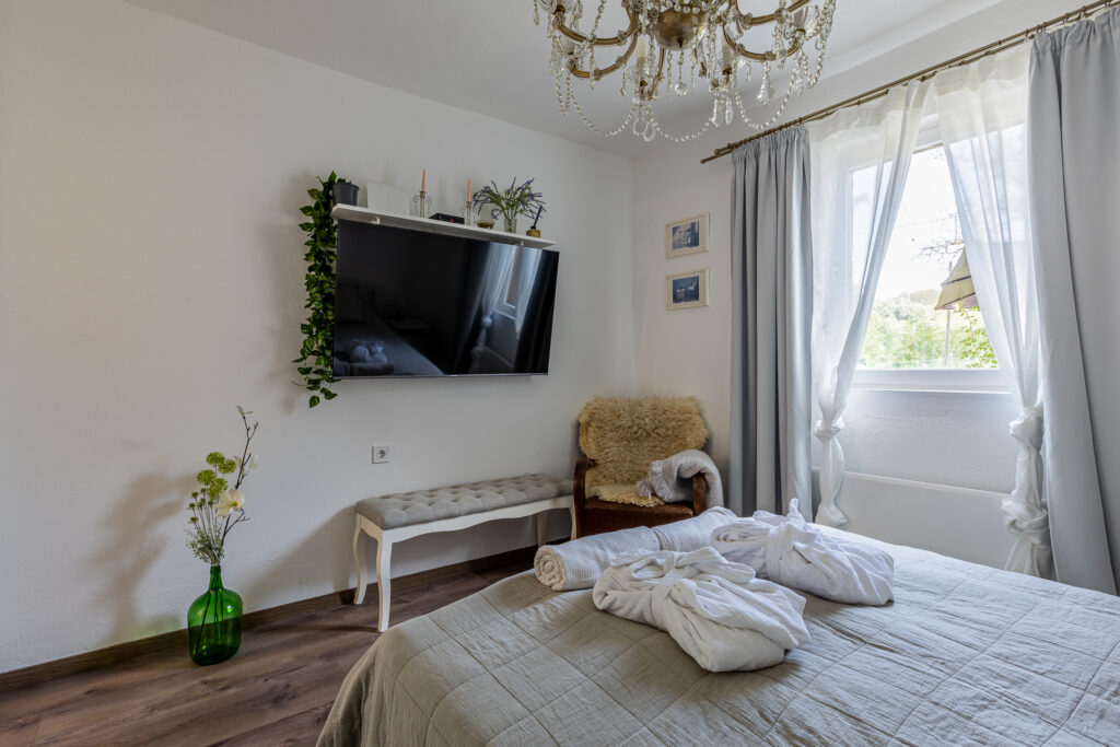 Élvezze a pihenést háborítatlan környezetben, és kapcsolódjon ki a hétköznapokból romantikus, intim hangulatú 2 személyes jacuzzis kisházunkban az erdő szomszédságában. Lazuljon a függönyökkel díszített hangulatos fedett terasz részen található, és egész évben üzemelő jacuzzinkban, vagy élvezze a reggeli kávéját madárcsicsergésben a teraszon. Rossz idő esetén pedig a 140 cm képátmérőjű TV – n böngészhetnek a Netflix filmkínálatából ingyenesen.