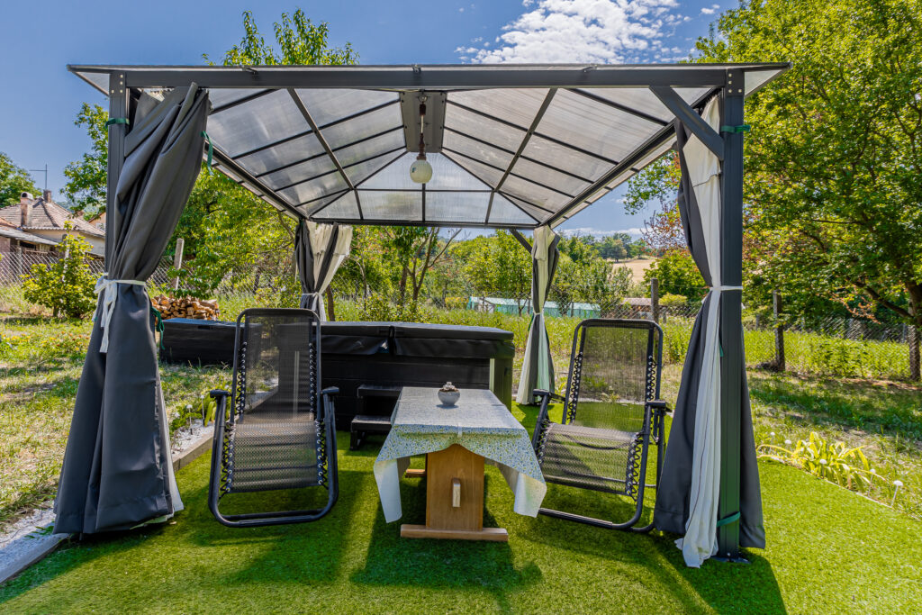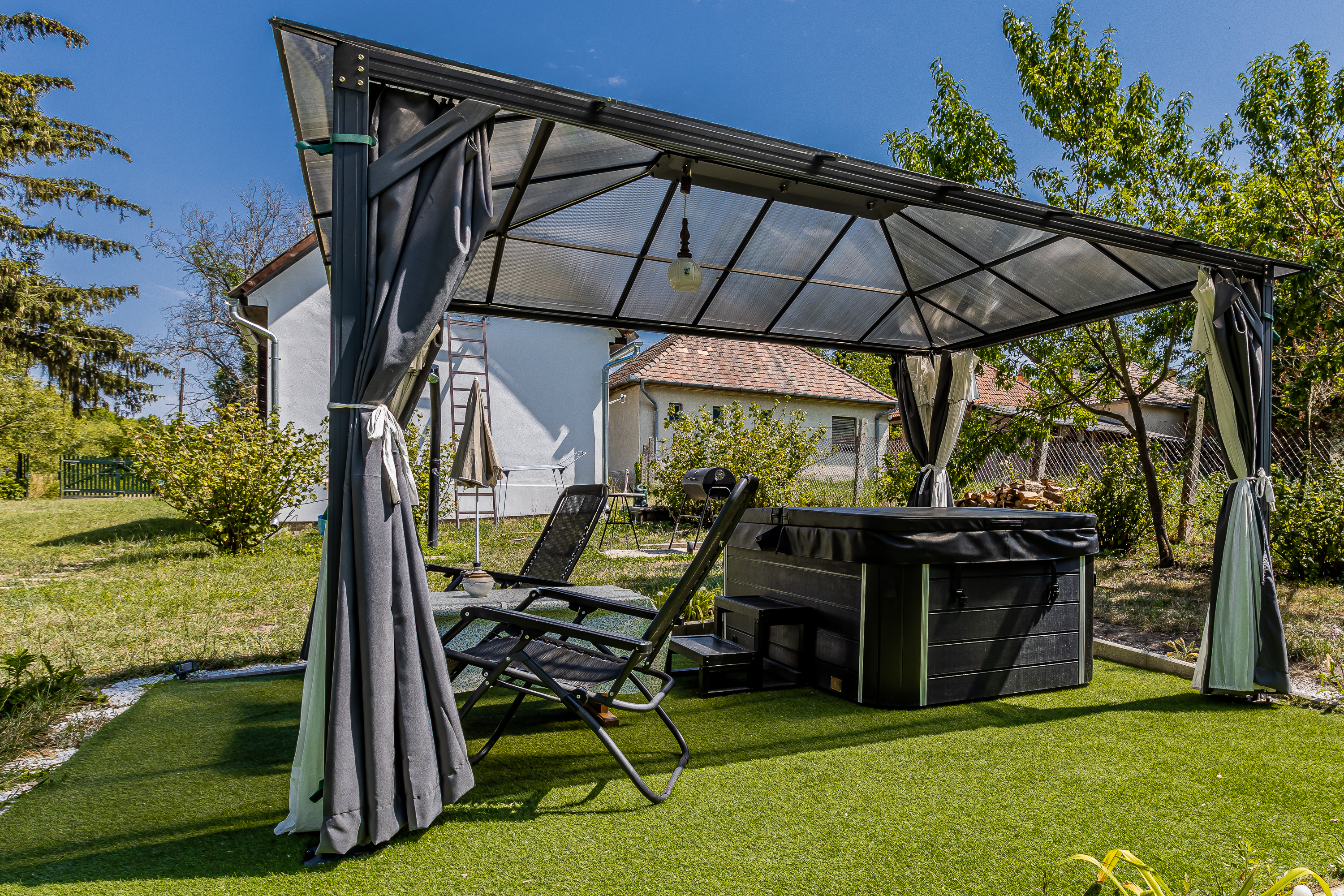 A függönyökkel díszített hangulatos fedett terasz részen található az egész évben üzemelő 2 személyes fekvőhellyel rendelkező jacuzzink, mely így rosszabb idő esetén is bármikor nagy élményt nyújt privát környezetben. A jacuzzihoz tartozó Bluetooth csatlakozási lehetőséggel akár fürdőzés közben is élvezhetik kedvenc zenéiket. A lazulást senki sem zavarja meg, hiszen az erdős rész a közvetlen szomszédunk. A nyitott, napernyővel is árnyékolható reggeliző teraszunkon pedig gondtalanul élvezhetik a reggeli kávét, vagy akár egy romantikus vacsora helyszíne is lehet. A csillagokon kívül az este fényét emelik a kültéri fény hangulatelemek is.