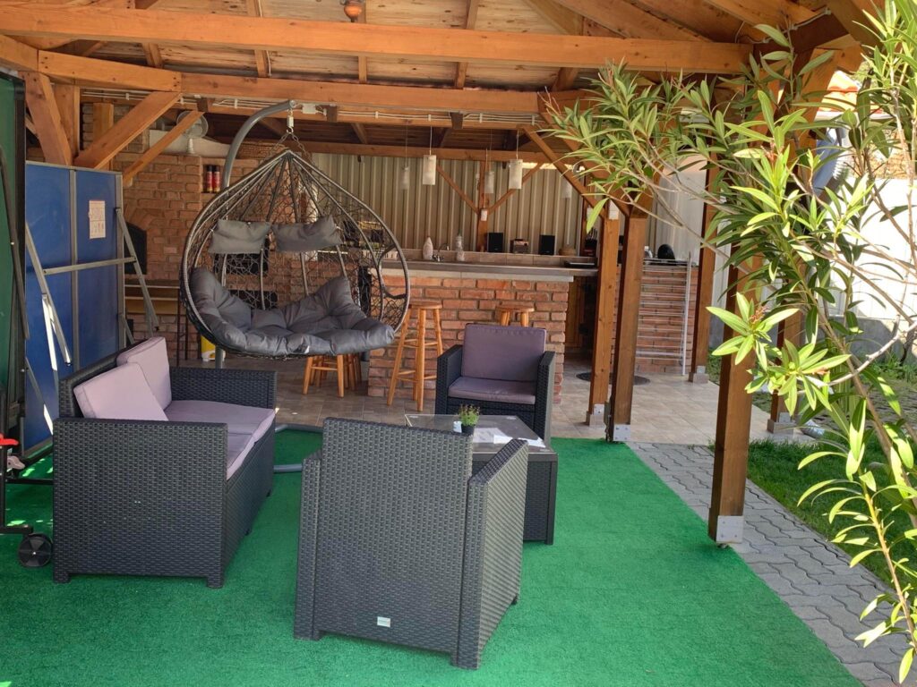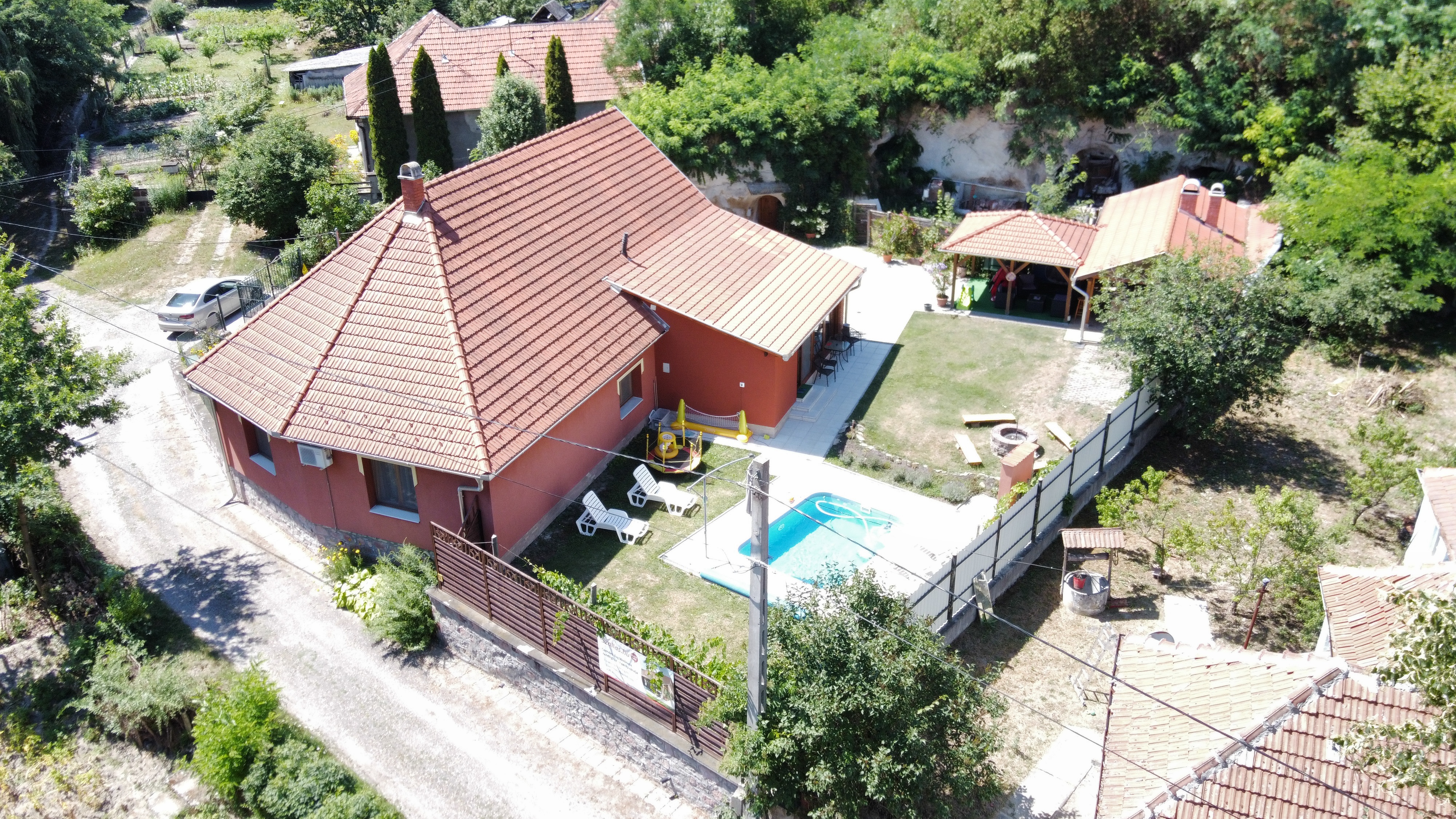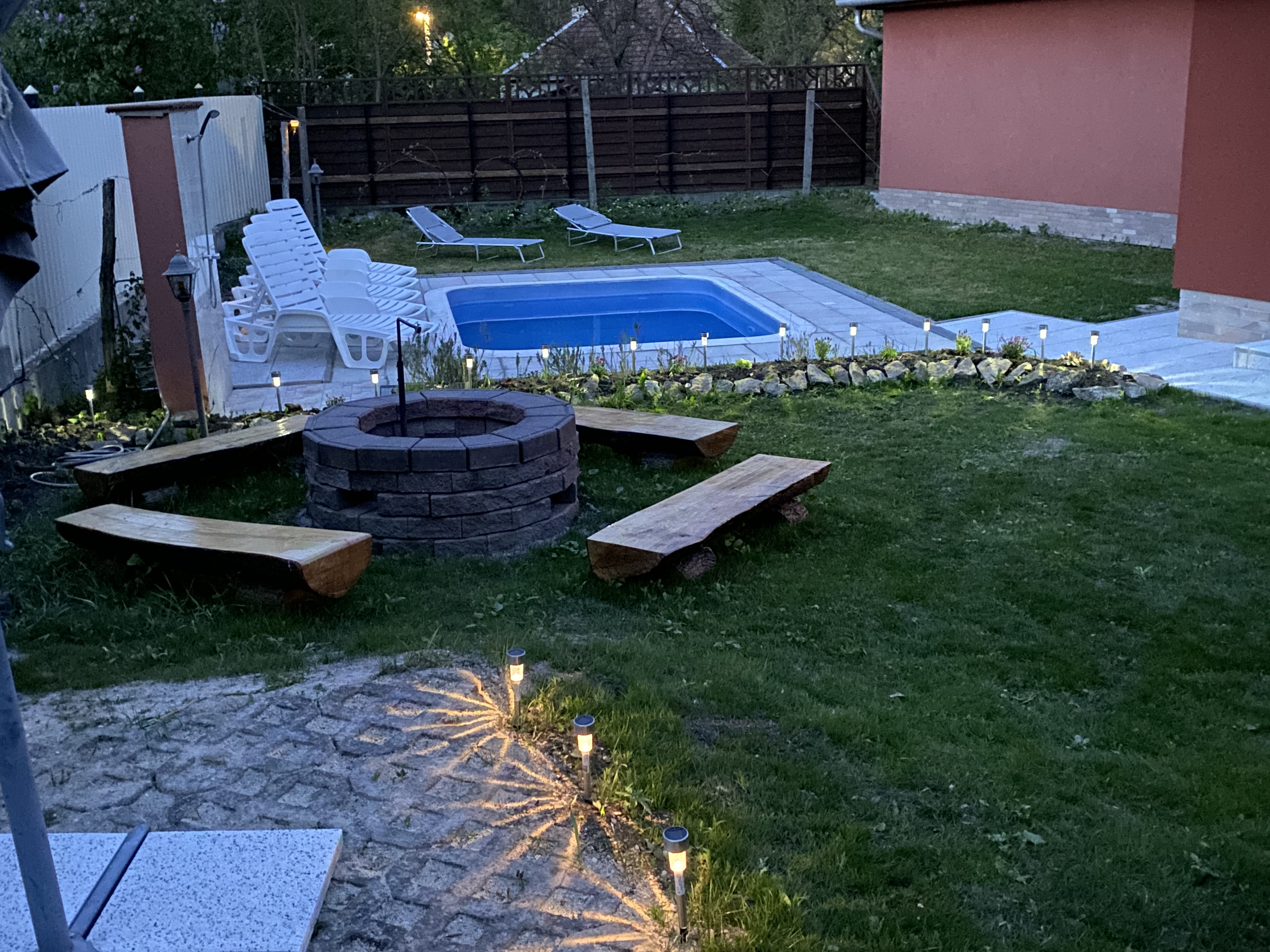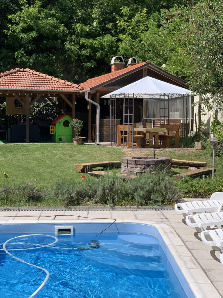 Az udvaron 3 x 4 méteres kültéri medence napágyakkal, kerti pavilon, 50 m 2-es kerti konyha ( konyhapult mosogatóval, kemence bogárcsoló, sparhelt, gázos grill, nyársak ) hűtő-fagyasztó valamint az elkészített ételek elfogyasztásához, beszélgetésekhez kerti garnitúra.