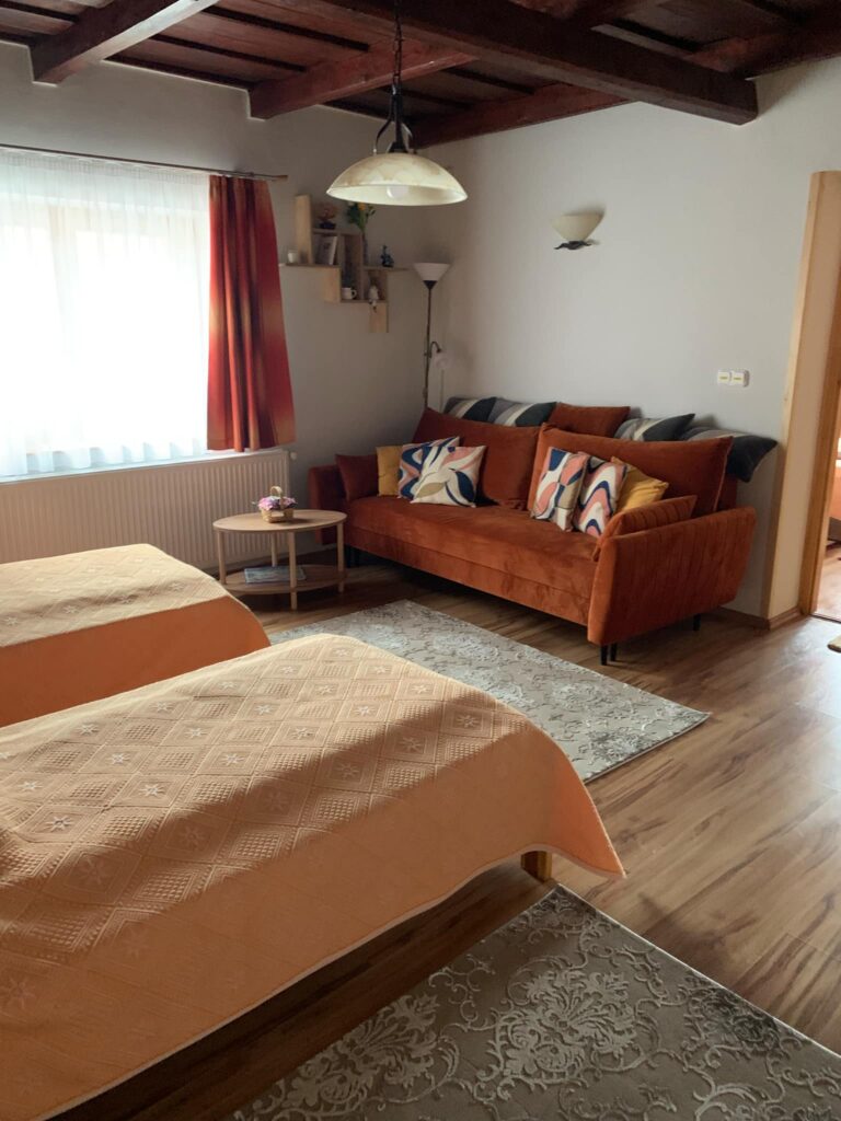 A vendégház két különálló lakrész található, így ideálisan két pár / család , azaz maximum 4 felnőtt és 4 gyerek kényelmes pihensét tudja biztosítani.