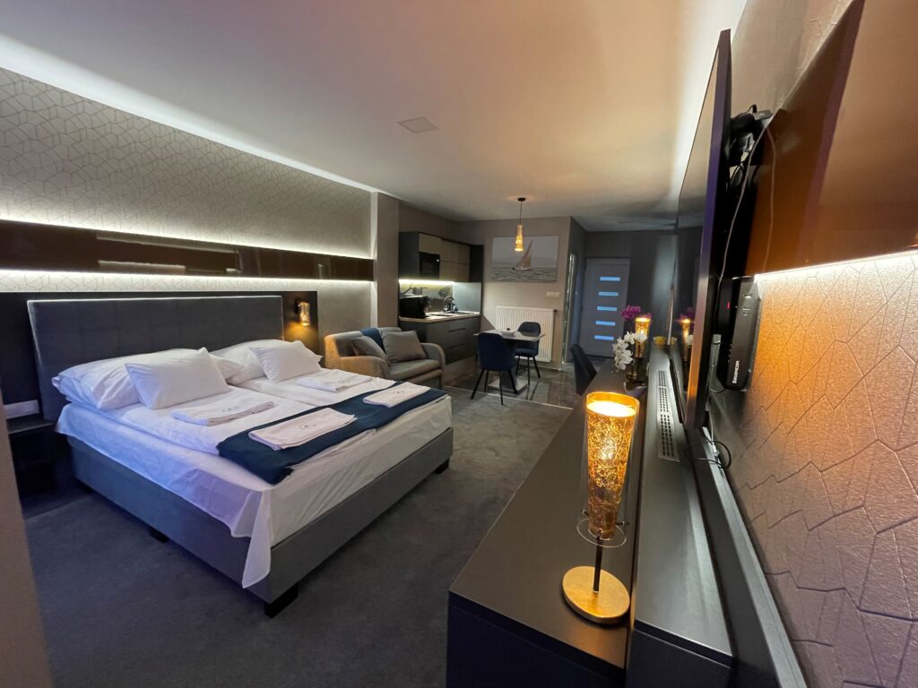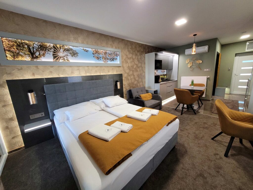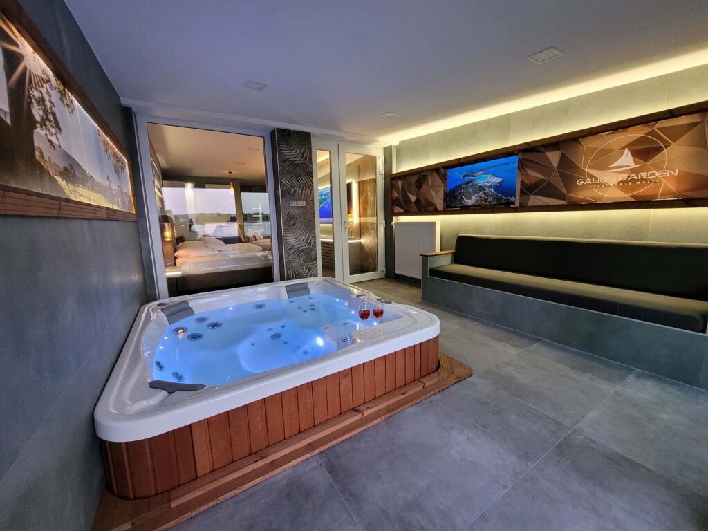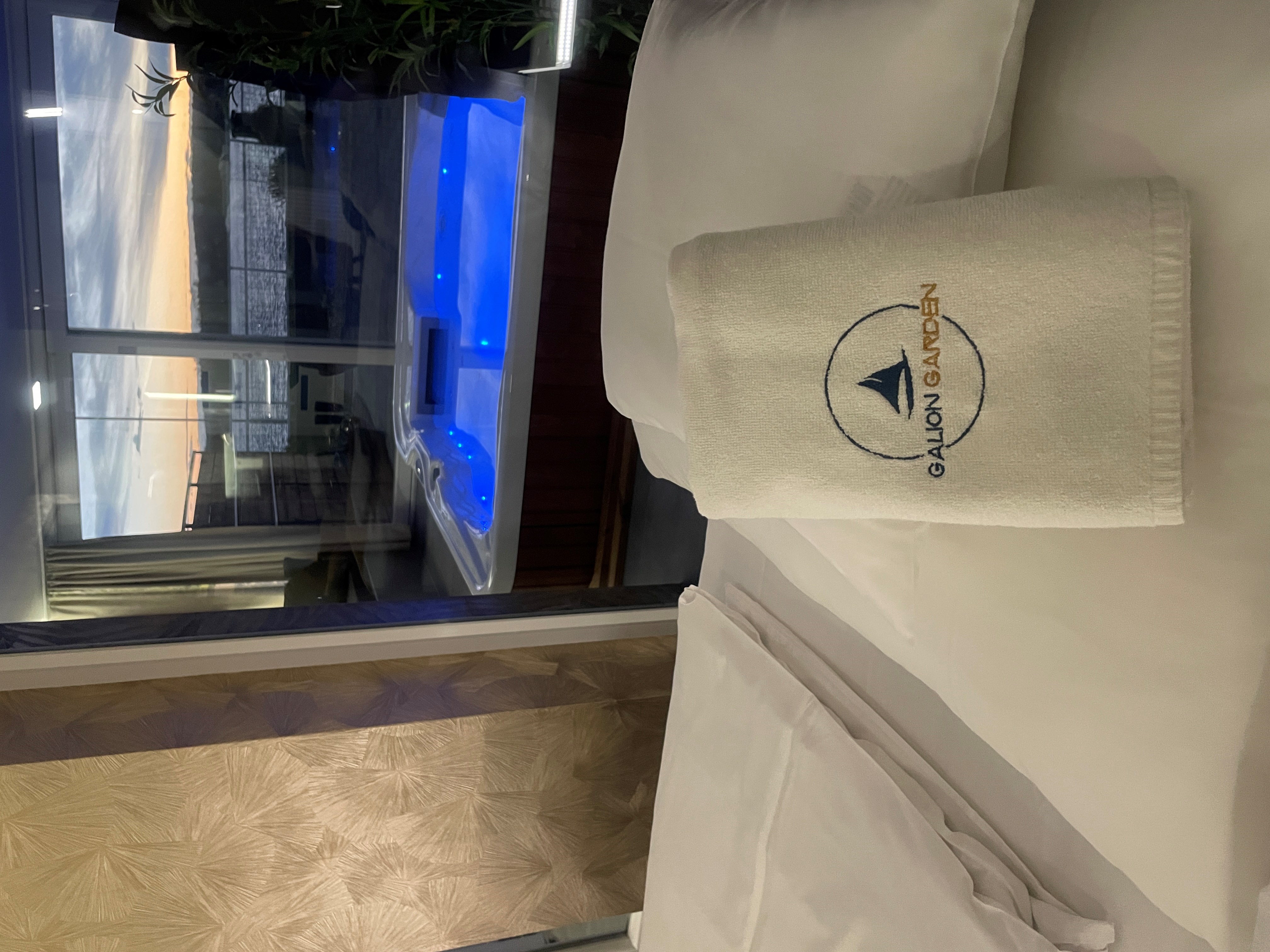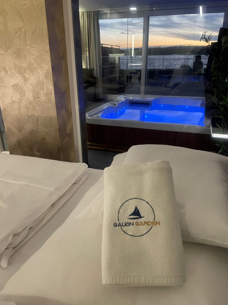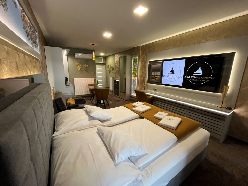 A különleges kialakítású klimatizált szoba és a fűtött jacuzzi részleg kertkapcsolattal, tópanorámával, jól felszerelt konyhával, minibárral, széles borkínálattal áll rendelkezésre. Az apartmanhoz óriás tévé, zárt parkoló, pihenőkert tartozik. Eredetileg 2 főre javasoljuk, de plusz 1 főre pótágyat is biztosítunk. Ha szeretnétek kicsit kimozdulni otthonról, de nem szeretitek a zsúfolt helyeket, akkor a Galion Gardenben a helyetek. A szállás az érkezés napján 14:00 órától foglalható el, a távozás napján pedig 10:00 óráig használható.