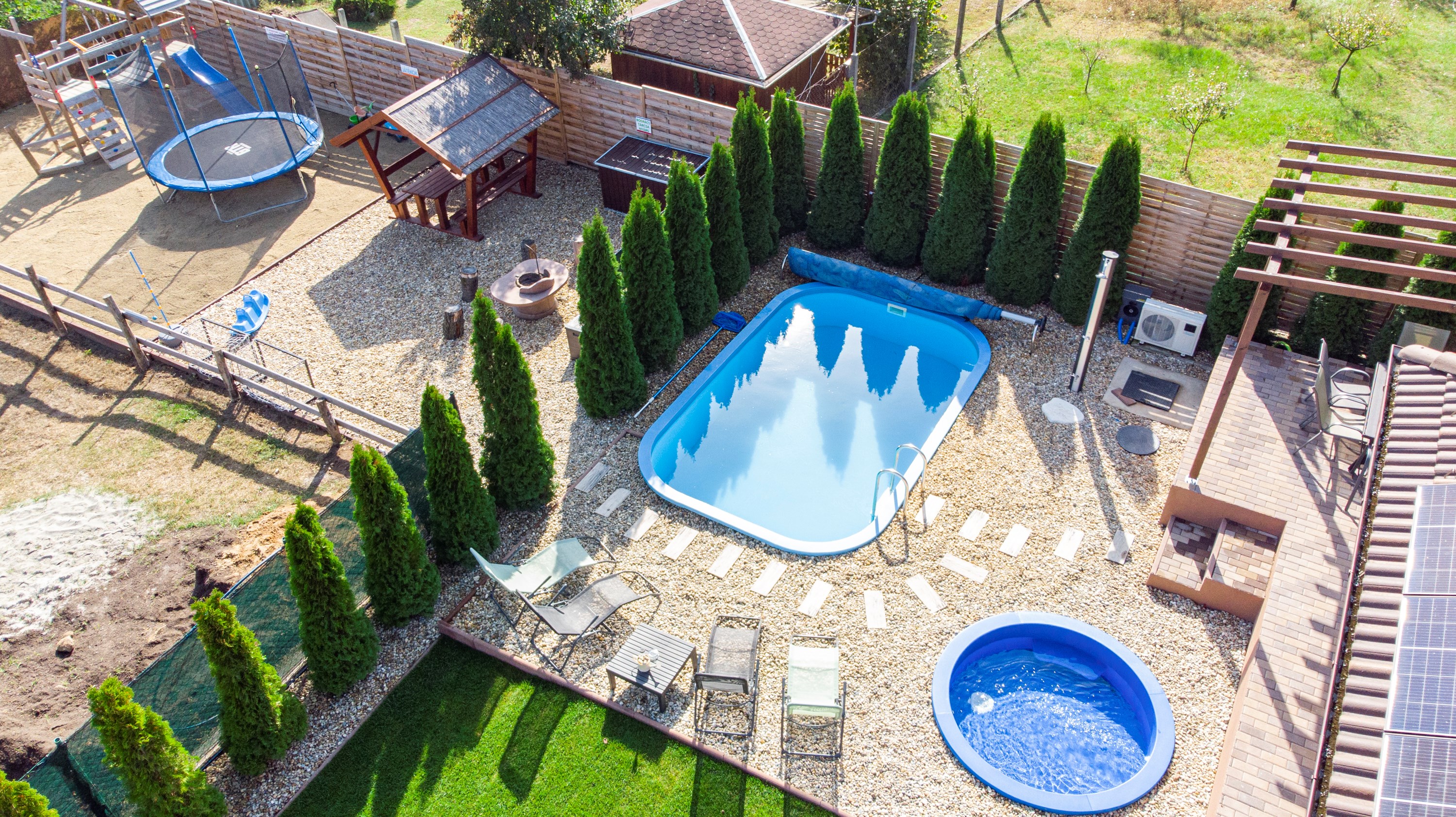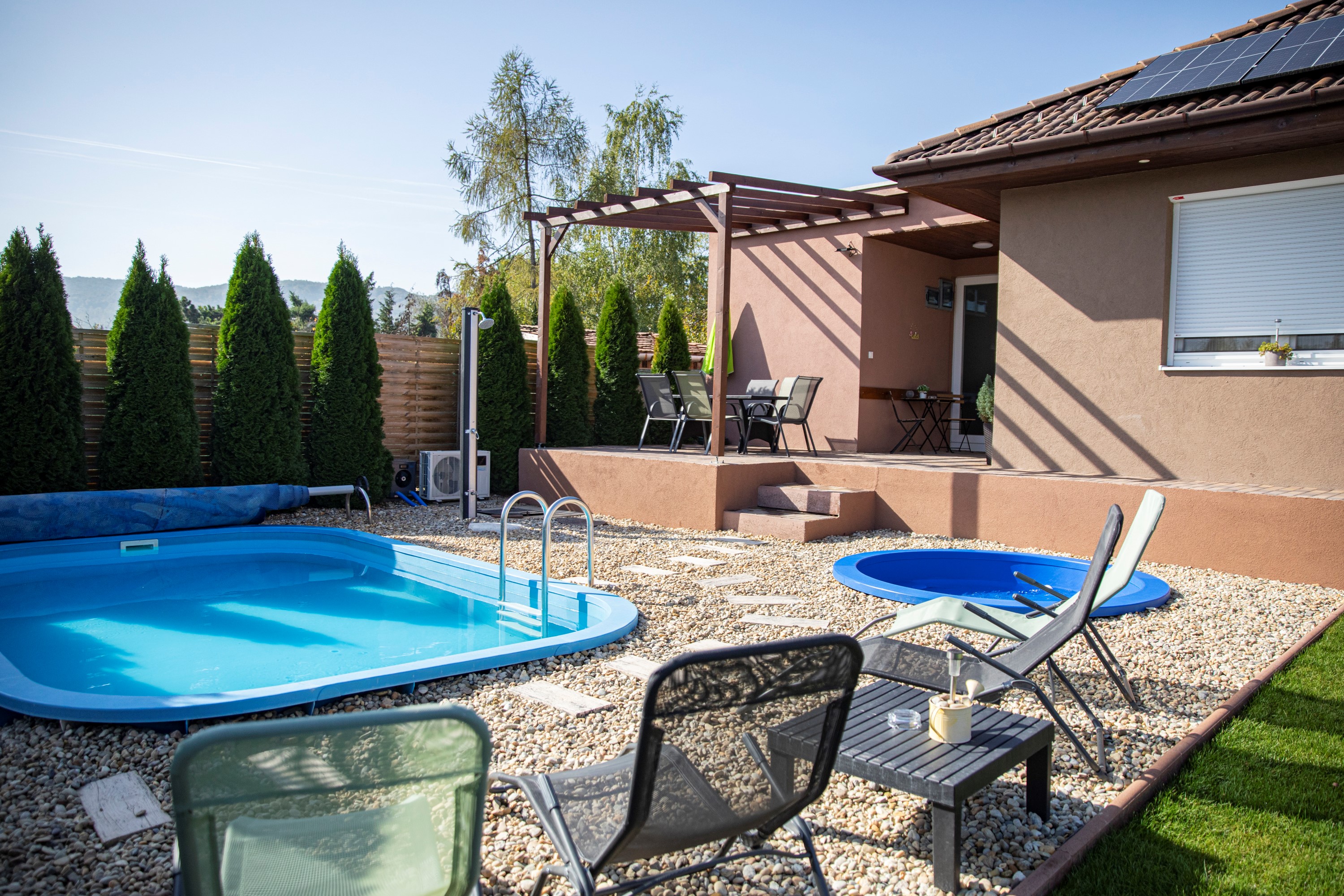 Mindkét vendégházunkat úgy alakítottuk ki, hogy a pihenés valóban csak Rólatok szóljon: kényelmes, modern belső terek, teljesen felszerelt konyhák, hangulatos nappali és gyönyörű privát kertek várnak Benneteket. A wellness részlegek – jakuzzival, infraszaunával és szezonális szabadtéri medencével – folyamatosan rendelkezésetekre állnak, így a feltöltődés garantált, akár hosszú hétvégére, akár több napos kikapcsolódásra érkeztek hozzánk.