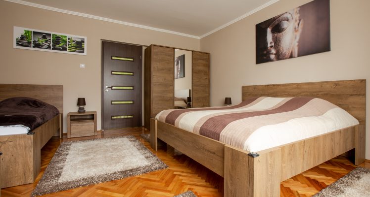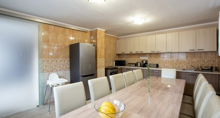 A házban 4 szoba van,mindegyik klimatizált, tv-vel felszerelt. Mindegyik szobában van 1 francia ágy,2 szobában 2 db 1 személyes és 2 szobában 1 db 1 személyes. Ezen a szinten található a külön álló wc illetve a zuhanyzós, kádas fürdőszoba. Az alsó szinten található a jól felszerelt konyha, mikróval,gáztűzhellyel ami villanysütős, kenyérpirítóval,vízforralóval, kávéfőzővel, alap fűszerekkel, evőeszközökkel, edényekkel. Illetve itt a wellness ( jakuzzi, szauna, gőz- és aroma kabin, 2 fűtött kőágy, zuhanyzó ) , zuhanyzó és külön wc.