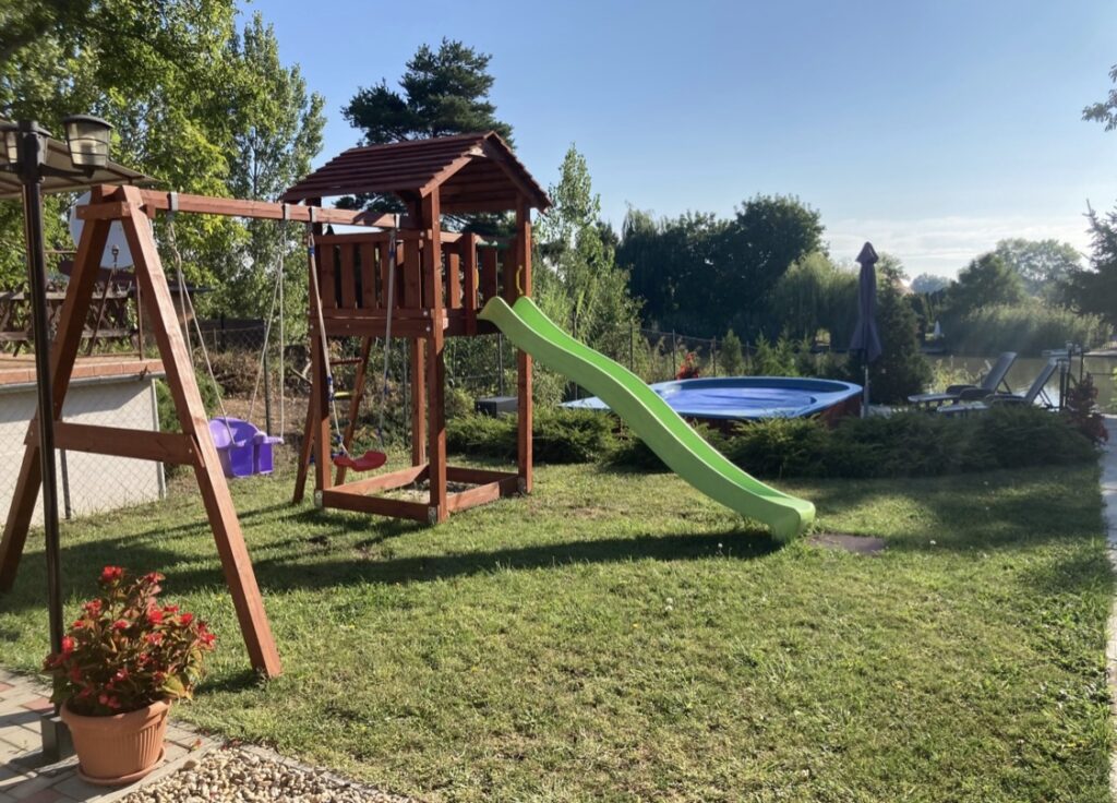 A gyermekeknek csúszdás mászókával, hintával kedveskedünk. Vízpartja a gyermekek elől kerítéssel elzárt.