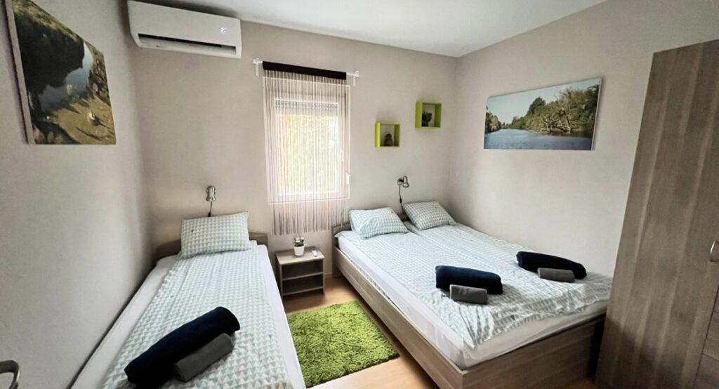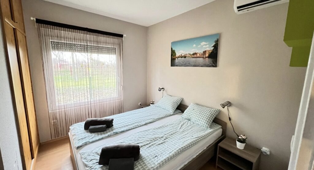 A ház 5+2 fő befogadására alkalmas. Két hálószobás, az egyikben egy franciaágy, a másikban egy francia és egy egyszemélyes ágy nyújt kényelmet az alváshoz. A nappaliban további két fő részére van lehetőség megágyazni. Vendégeink számára ágyneműt biztosítunk. A szobák ablakai redőnnyel, szúnyoghálóval ellátottak.
