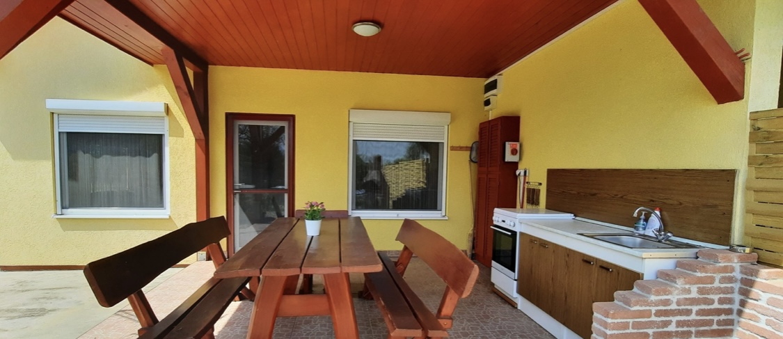 Terasza fedett, nyári konyhával (tűzhely, pult, mosogatótálca), kiülővel ellátott.