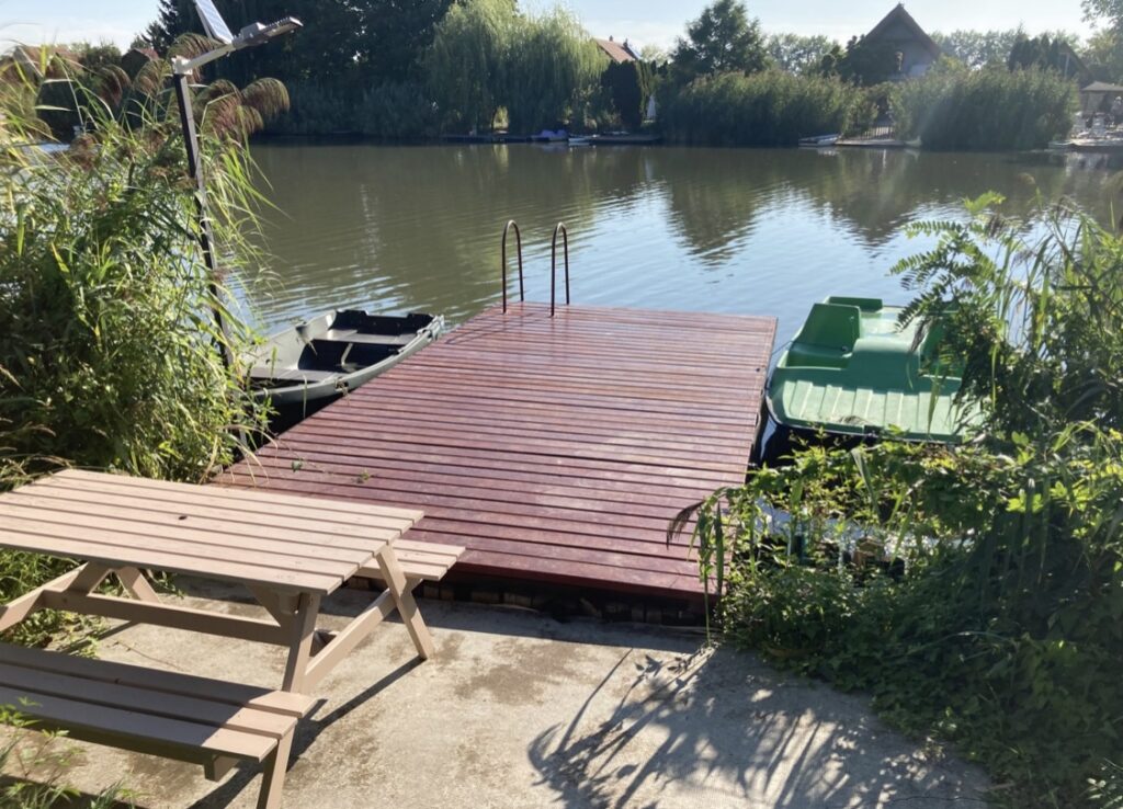 A nyaraló tartozéka és korlátlanul használható a holtág felfedezéséhez egy csónak, amelyről akár horgászni is lehet a stégen kívül.
