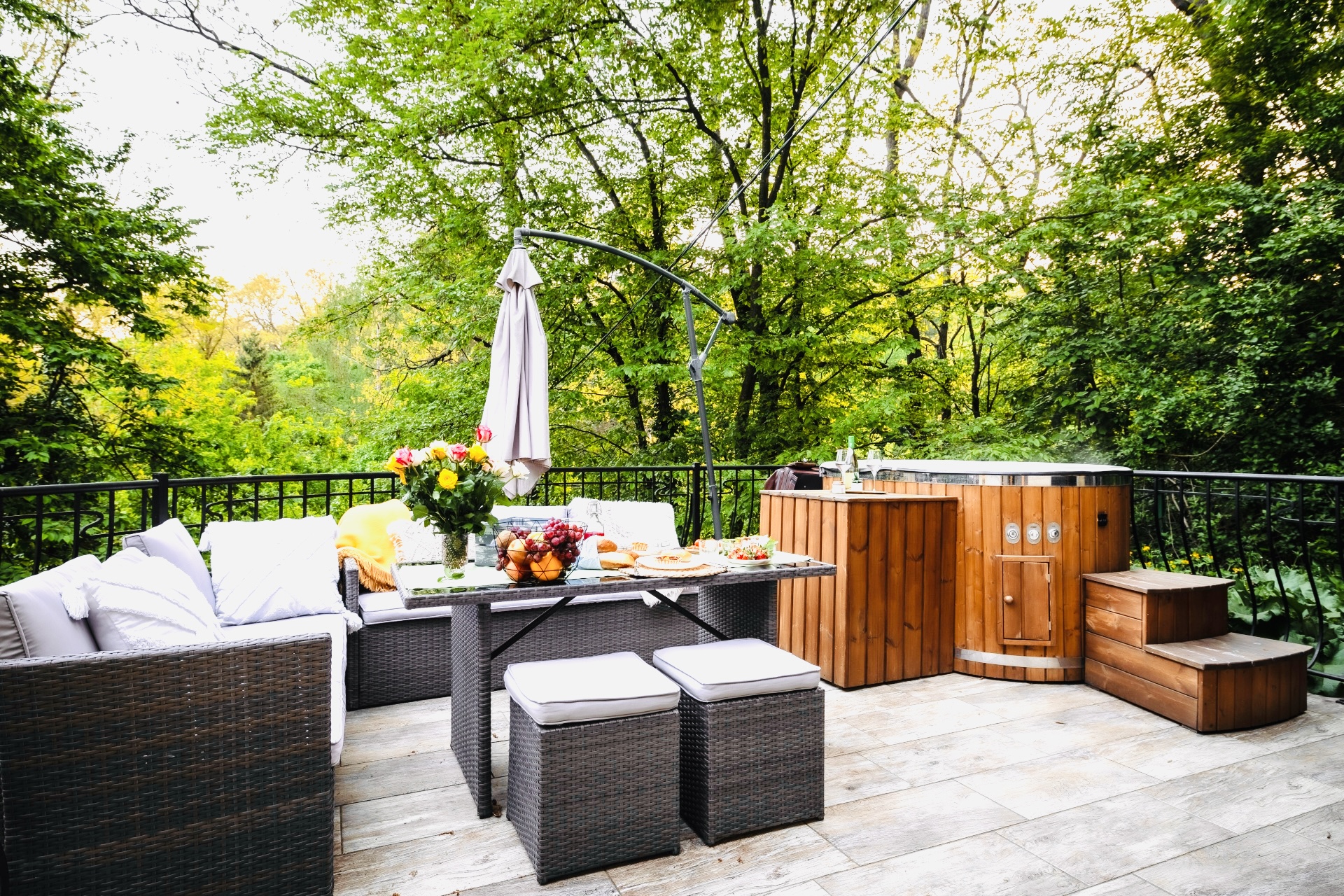 Lombkorona szinten levő erdei vadász villánk ideális hely az elvonuláshoz, feltöltődéshez, és a kikapcsolódáshoz. Madárcsicsergésre ébredve, a friss erdei levegőn tudjátok a reggeli kávét a teraszon meginni, miközben mókusok ugrálnak az ágakon. A felső teraszon levő hydromasszázsos dézsafürdőben ülve a tölgyerdő ölelésében gyönyörködhettek az erdei környezetben. Az infraszaunával érdemes kombinálni, hiszen kitűnő immunerősítő, méregtelenítő és stresszoldó hatása van.Ajánljuk a közeli kedvelt kirándulóhelyeket, kilátókat, a szomszéd utcából több két túra útvonal nyílik. A királyréti erdei kisvasút megállója pár sétatávolságra található. Biciklire pattanva pedig 10 perc alatt a Dunapartra érhettek, és bejárhatjátok a csodás partot, a naplementében gyönyörködve.