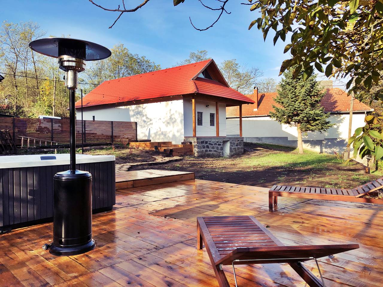 A vendégházhoz a kertben egy 6 személyes jakuzzi, 2 napozó terasz, illetve szabadtéri tűzrakó tartozik bográcsozási, tárcsás sütési lehetőséggel.