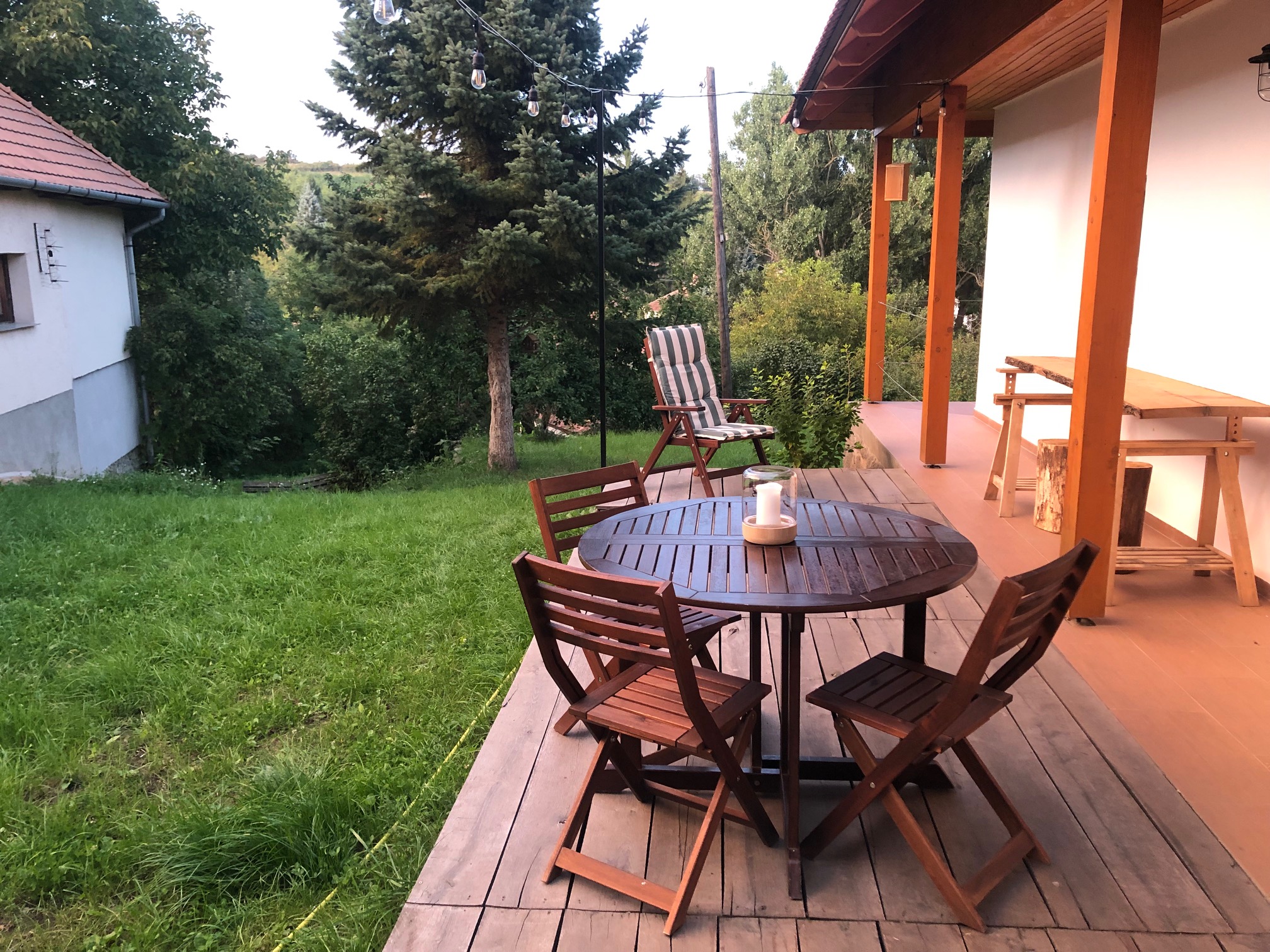 A vendégházhoz a kertben egy nagyobb terasz, illetve szabadtéri tűzrakó tartozik bográcsozási, tárcsás sütési lehetőséggel.