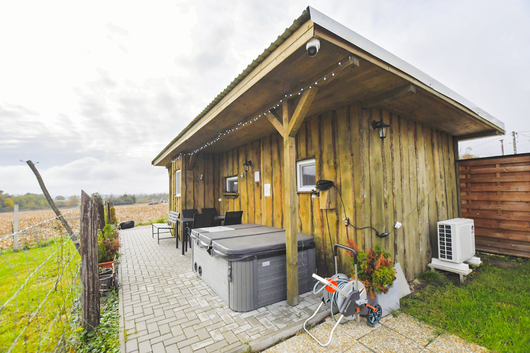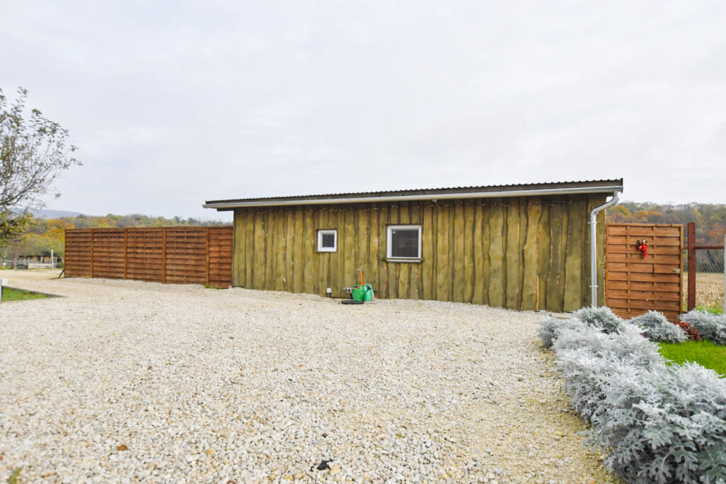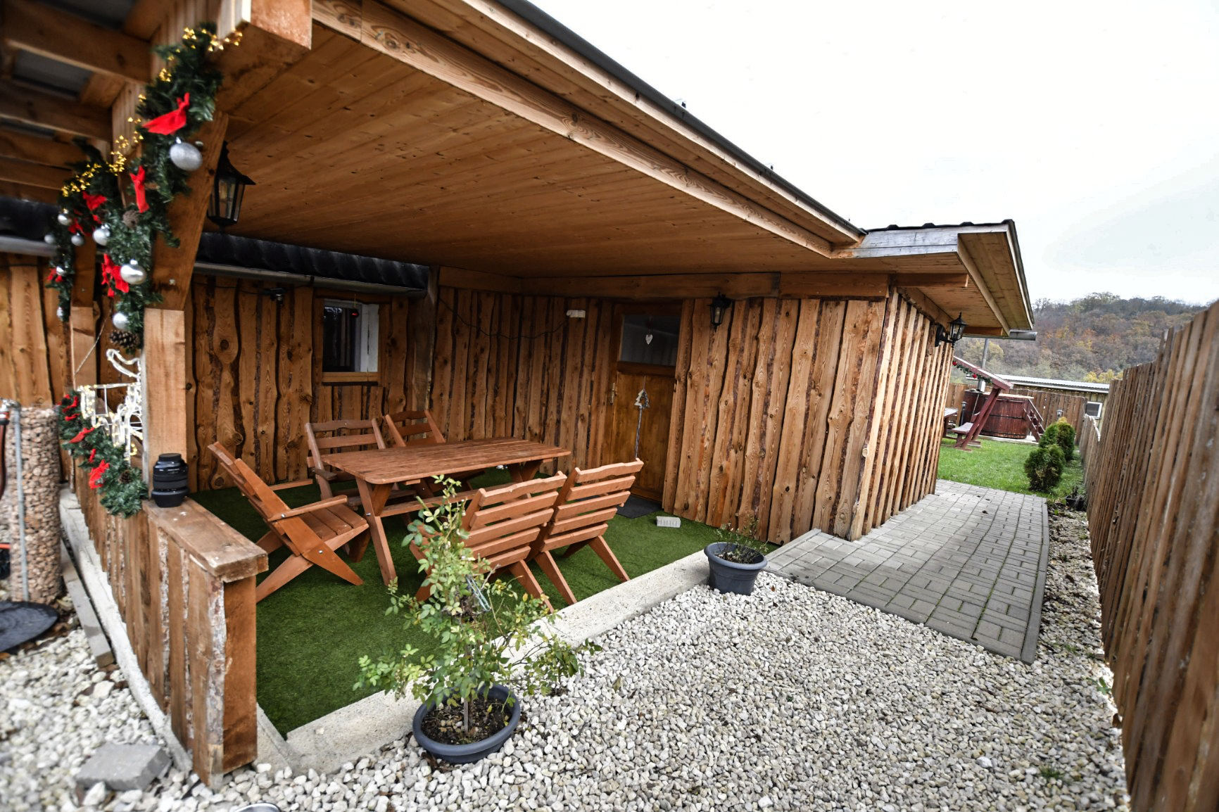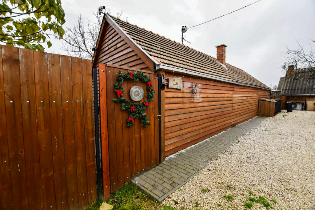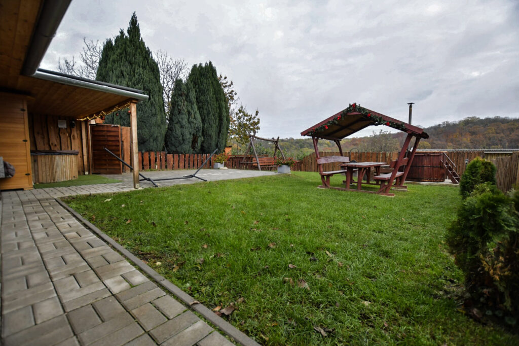 A zárt udvarban külön kerti bútorok, grillező, bográcsozási lehetőség és fedett jacuzzi (egész évben) szolgálja a kellemes pihenést. Igazi kis világ elől elbújós kuckó, tökéletes pároknak, vagy pedig aki egyedül szeretne egy kicsit elbújni! Erdőre néző kilátás, reggelente őzikéket is láthatunk, ahogy sétálgatnak a kerítés túloldalán.