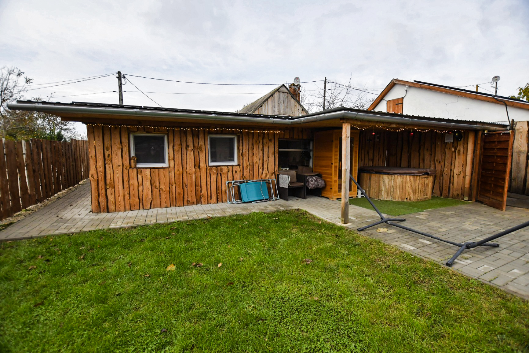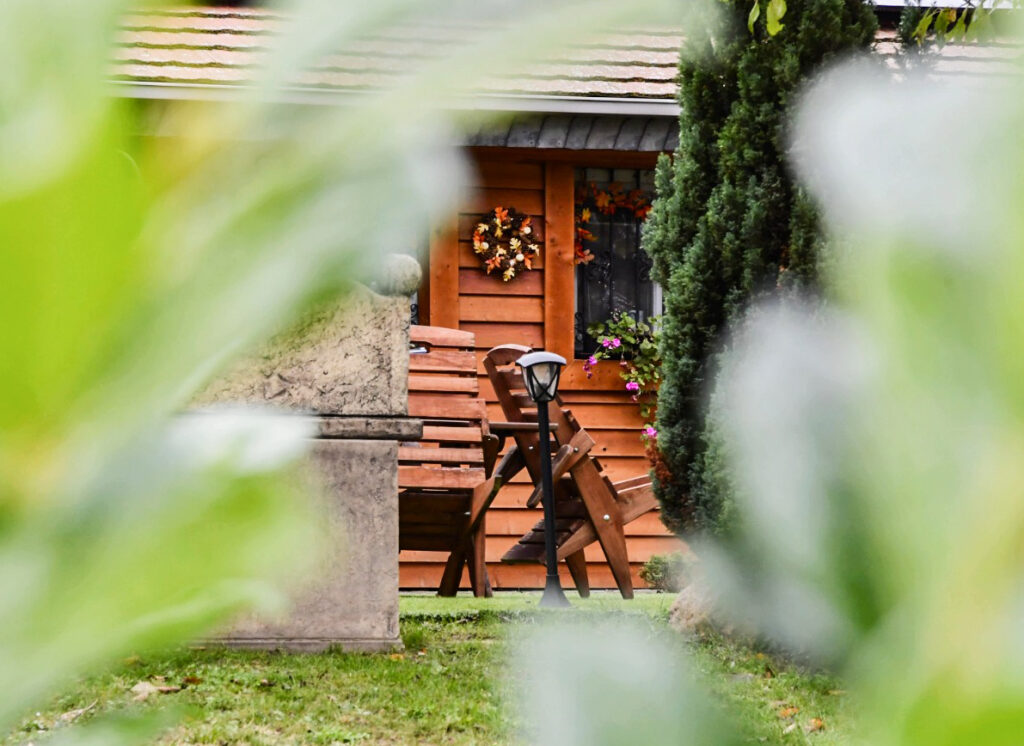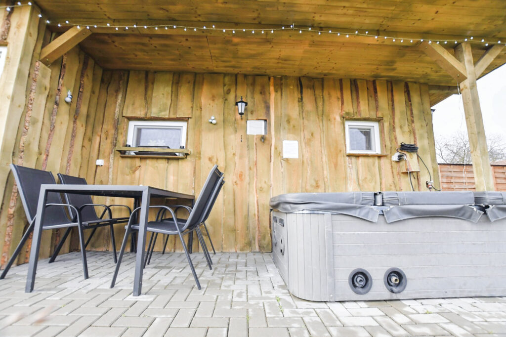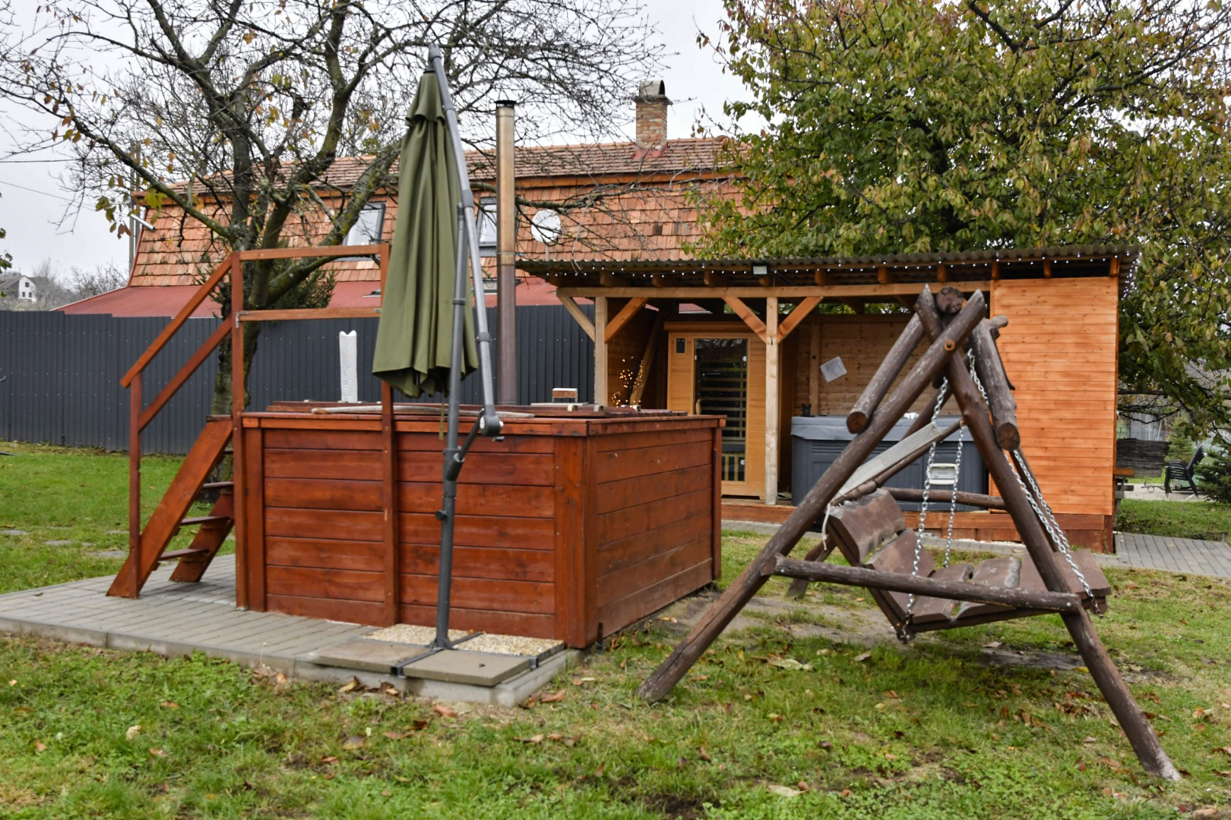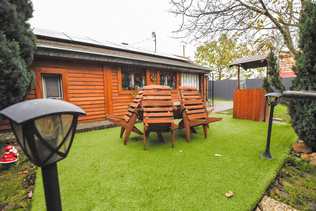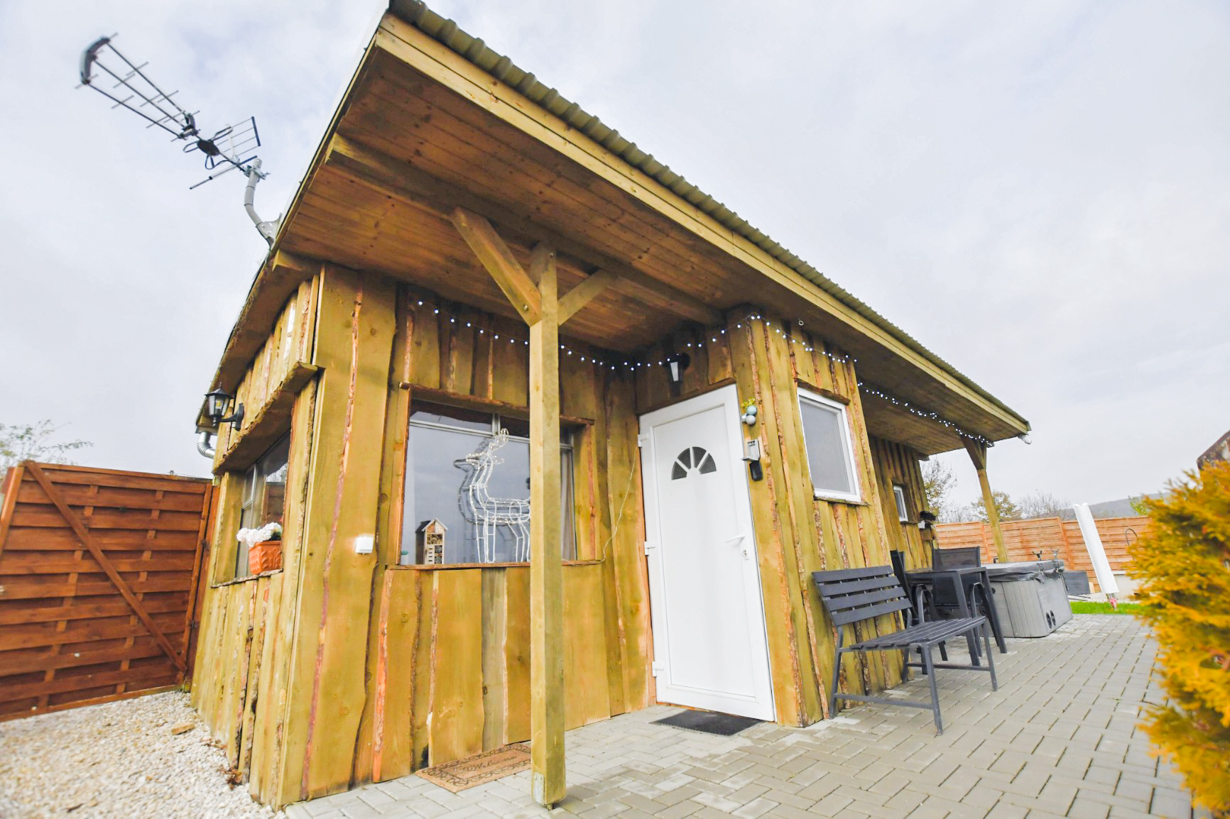 A zárt udvarban külön kerti bútorok, grillező, bográcsozási lehetőség és fedett jacuzzi (egész évben) szolgálja a kellemes pihenést. Igazi kis világ elől elbújós kuckó, tökéletes pároknak, vagy pedig aki egyedül szeretne egy kicsit elbújni! Erdőre néző kilátás, reggelente őzikéket is láthatunk, ahogy sétálgatnak a kerítés túloldalán.