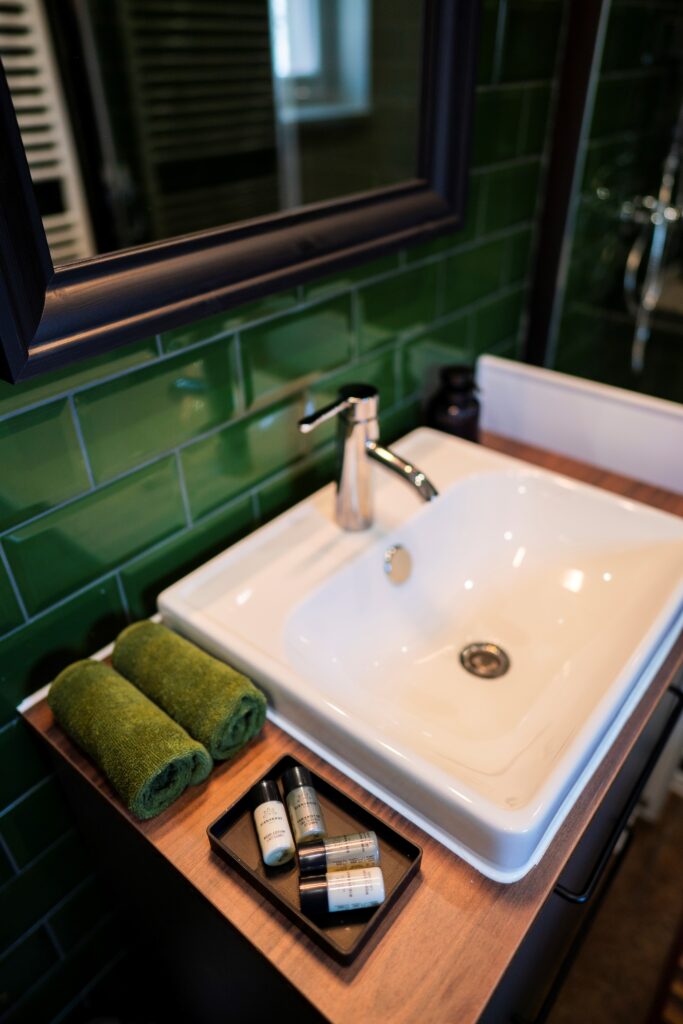 Modern fürdőszoba – Esőztető zuhannyal, puha törölközőkkel és piperecikkekkel