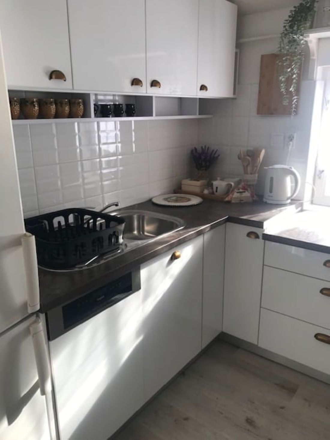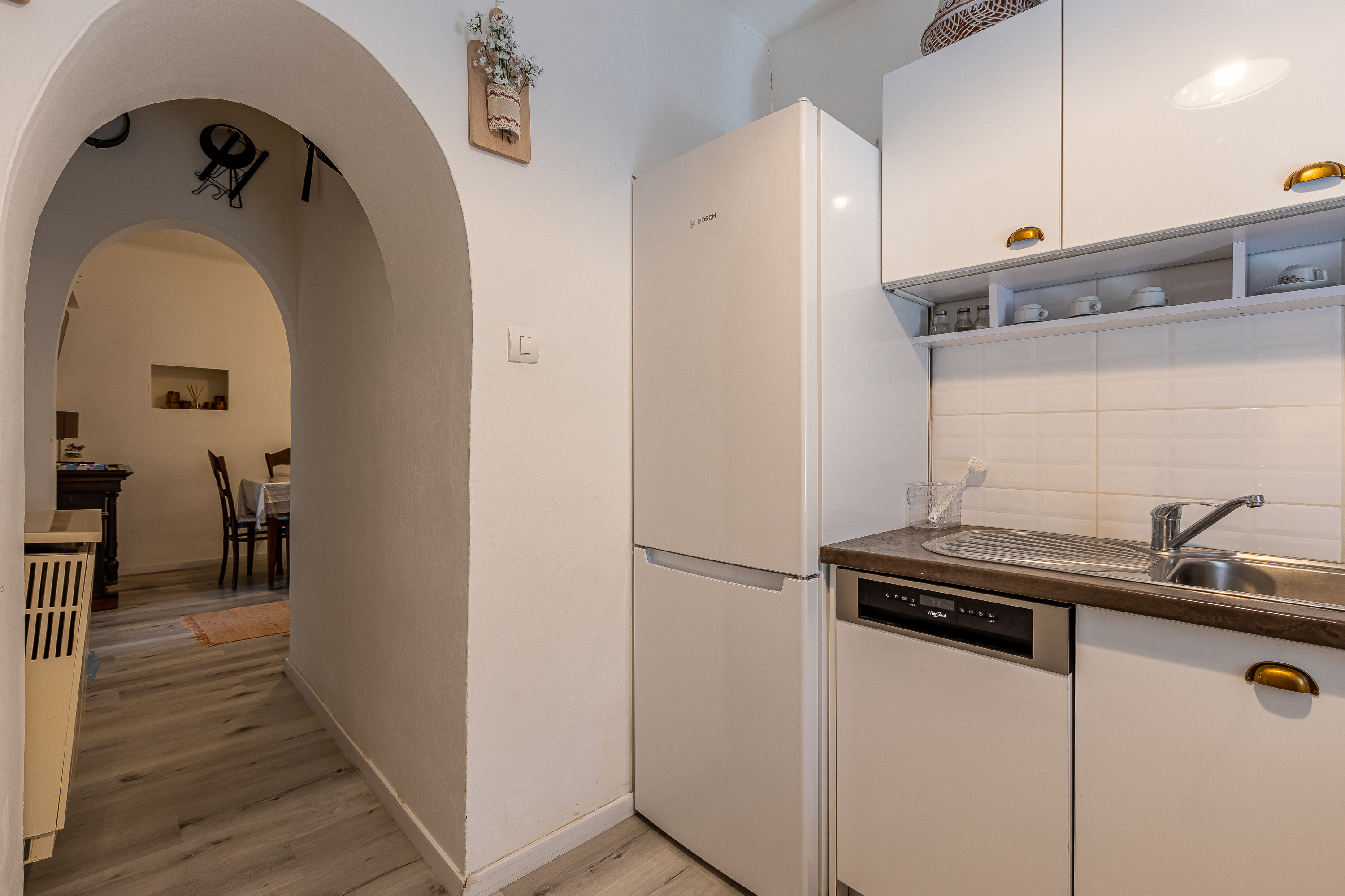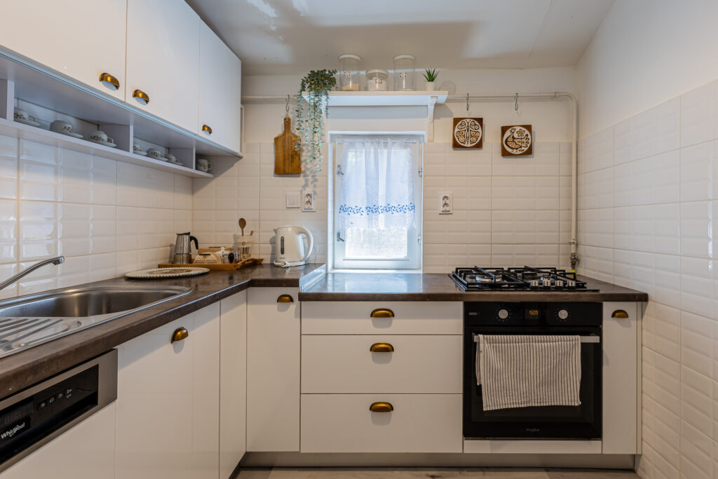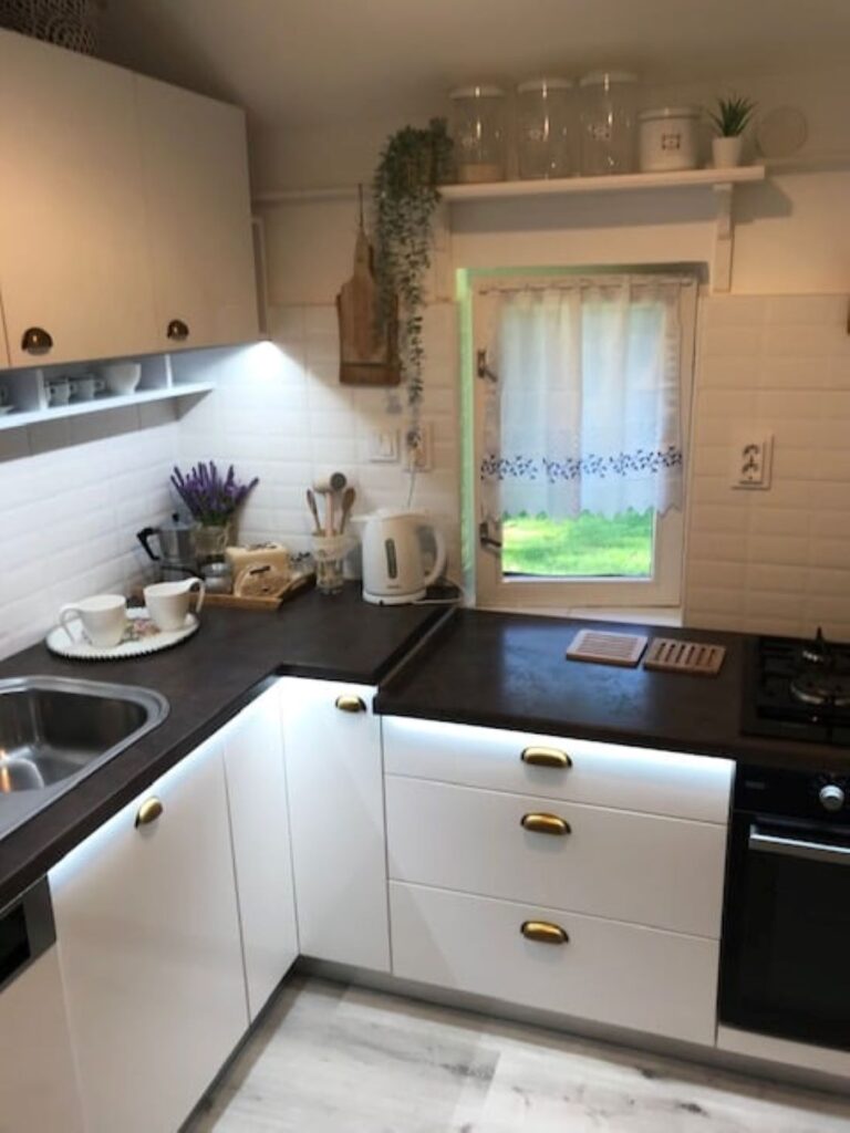 – teljesen felszerelt konyha, mosogatógép, hűtőszekrény mélyhűtővel, beépített gáztűzhely- villany sütővel, mikrohullámú sütő, kávéfőző, vízforraló