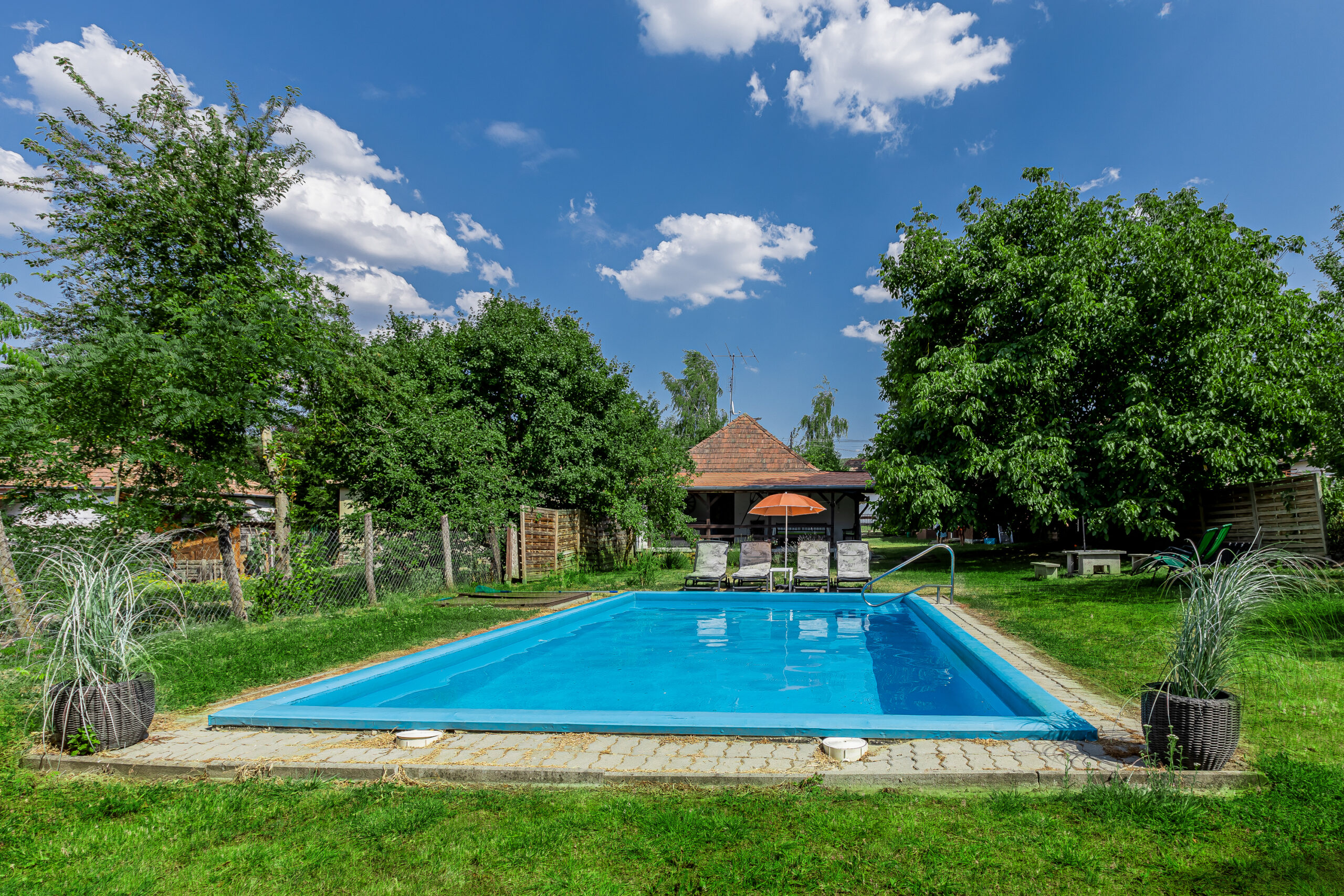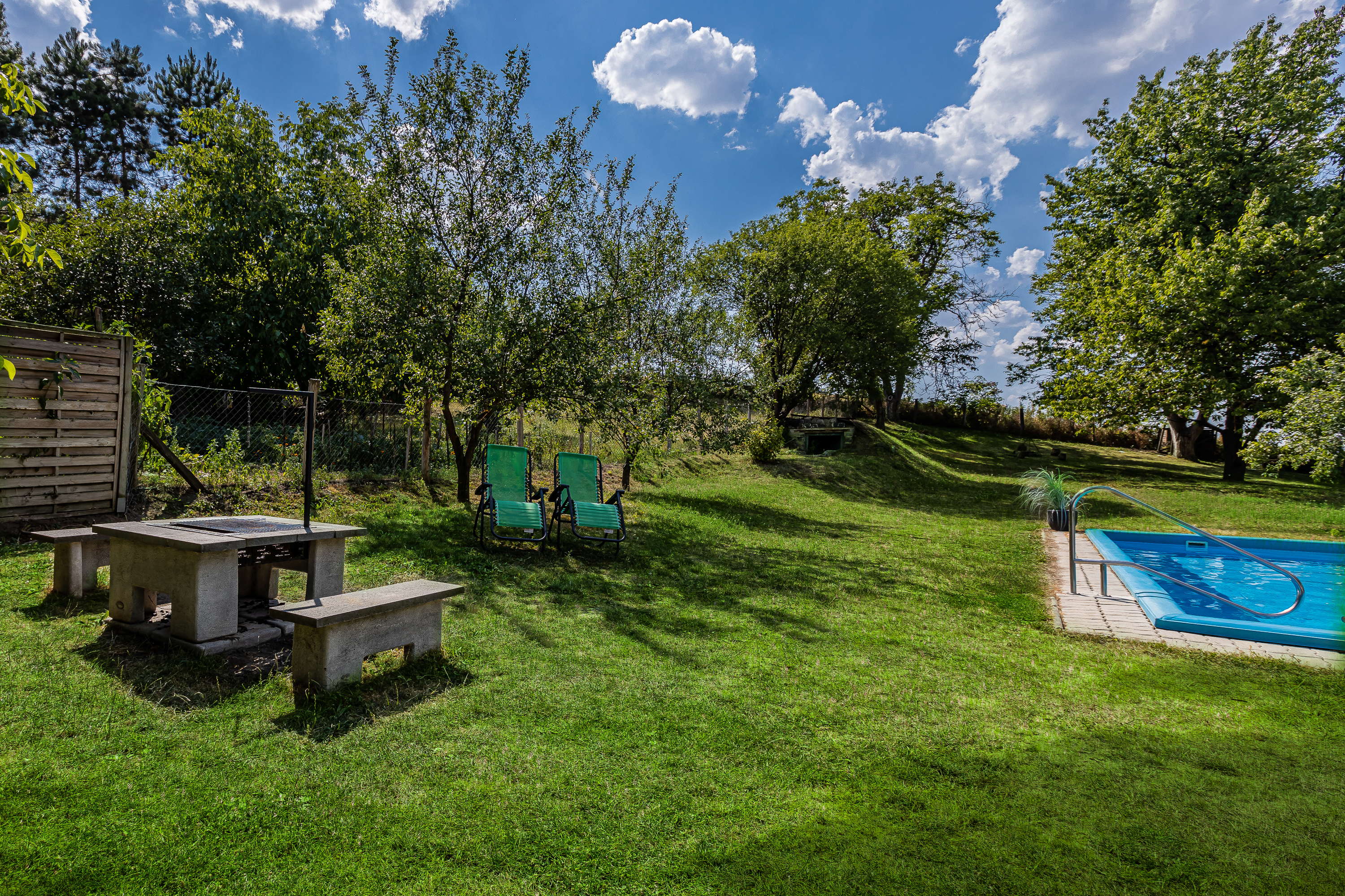 – medencére, kertre néző nagy nyitott terasz (kb 40 nm2,) nagy étkezőasztallal 8 fő részére, és étkezőasztal 4 fő részére, terasz hűtőszekrény