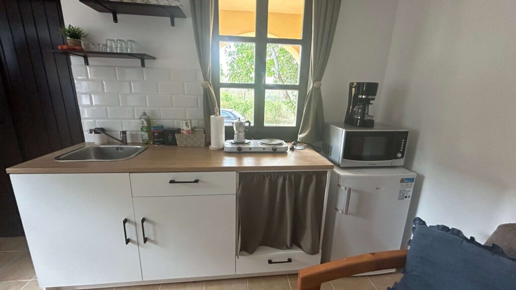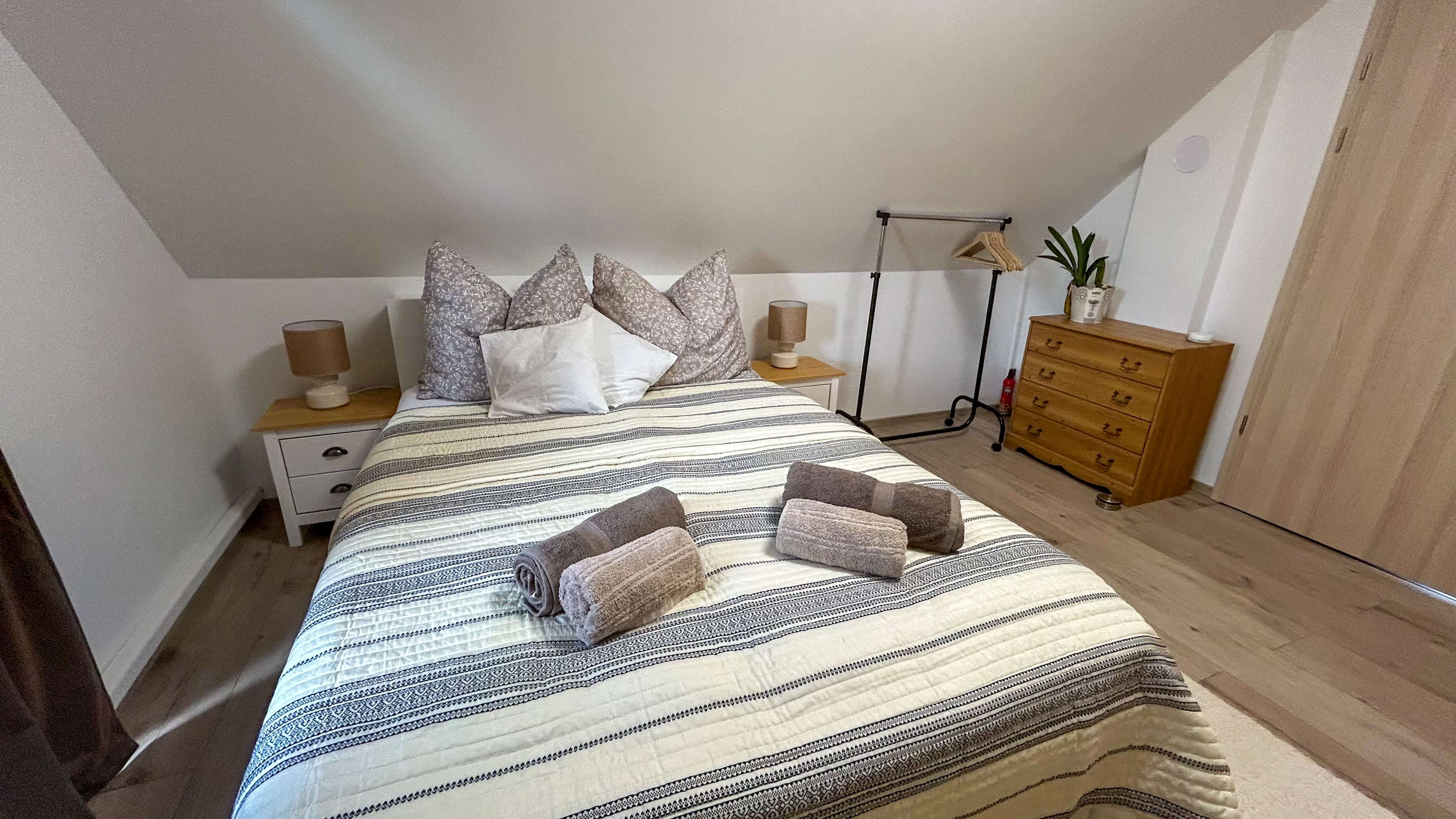 A szálláson az emeleten egy nagy franciaágy, vele szemben egy kihúzható kanapéágy, a földszinten pedig szintén egy kihúzható kanapéágy található.