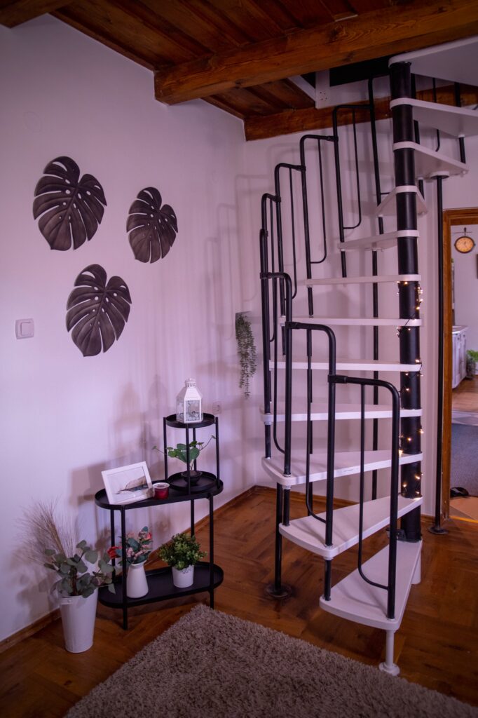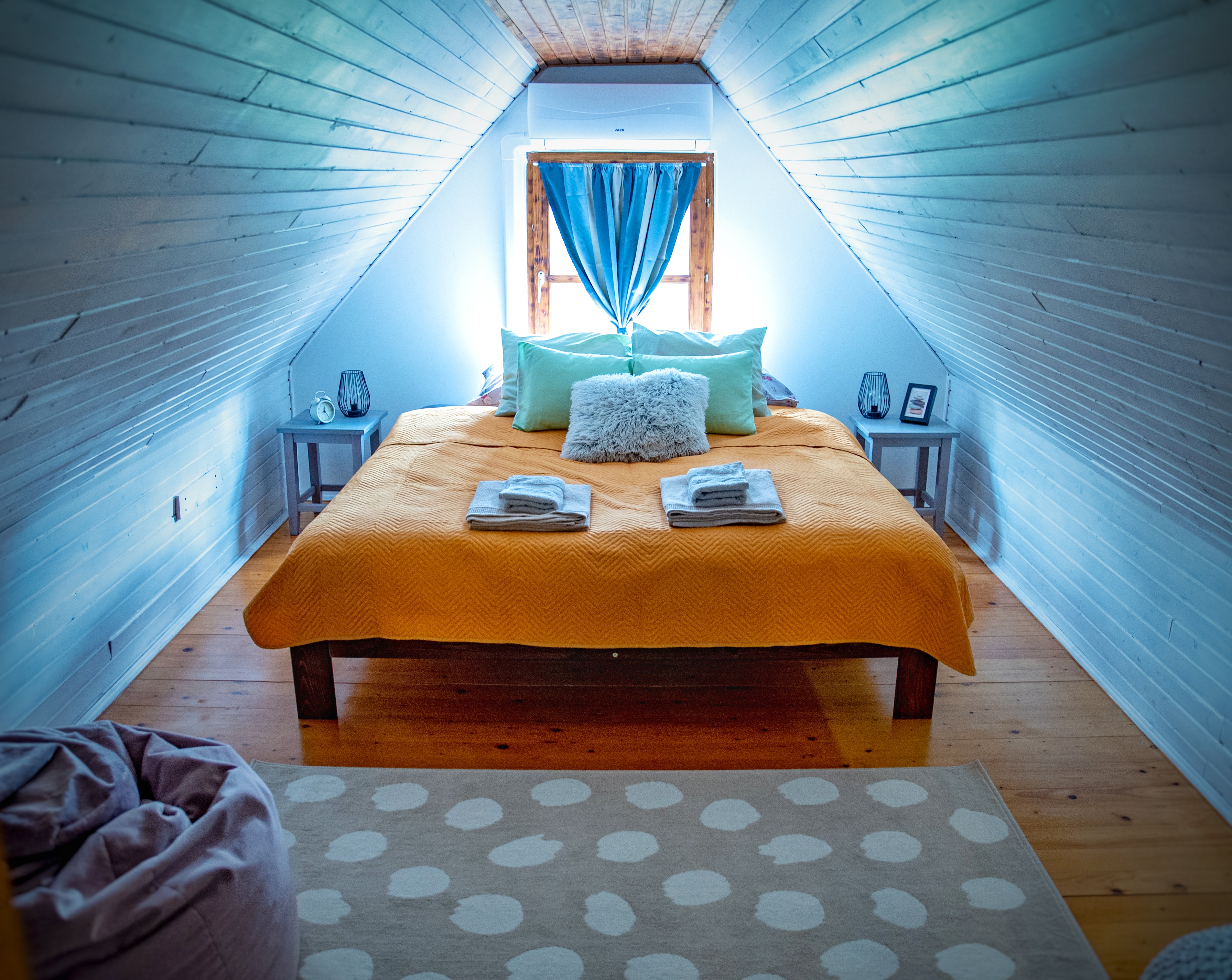 Az emeleten 2 tágas, külön bejáratú hálószoba vár benneteket egy-egy kényelmes franciaággyal. Zuhanyzós fürdőszobánk WC-vel ellátott. Az emeleti pihenősarokban pedig nyugodtan töltheted az énidődet például kedvenc könyved társaságában.