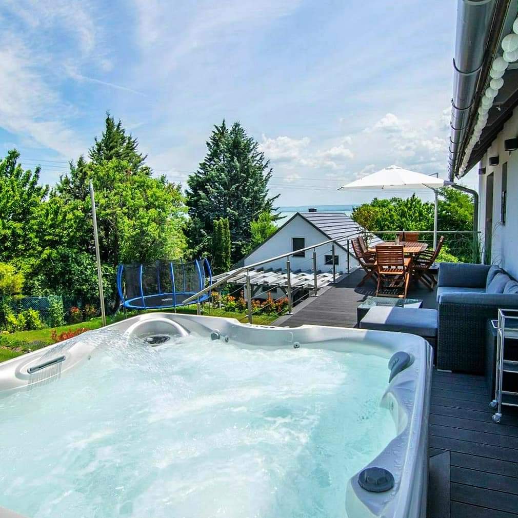 Vendégeink kikapcsolódását privát kert, grillezési lehetőség biztosítja. Az egész évben használható kültéri jakuzziból csodás kilátás nyílik a Balatonra, a kombinált finn- és infra szauna tökéletes wellness élményt biztosít akár zordabb időjárási körülmények között is.