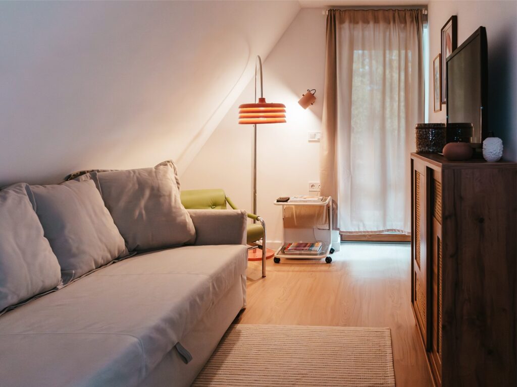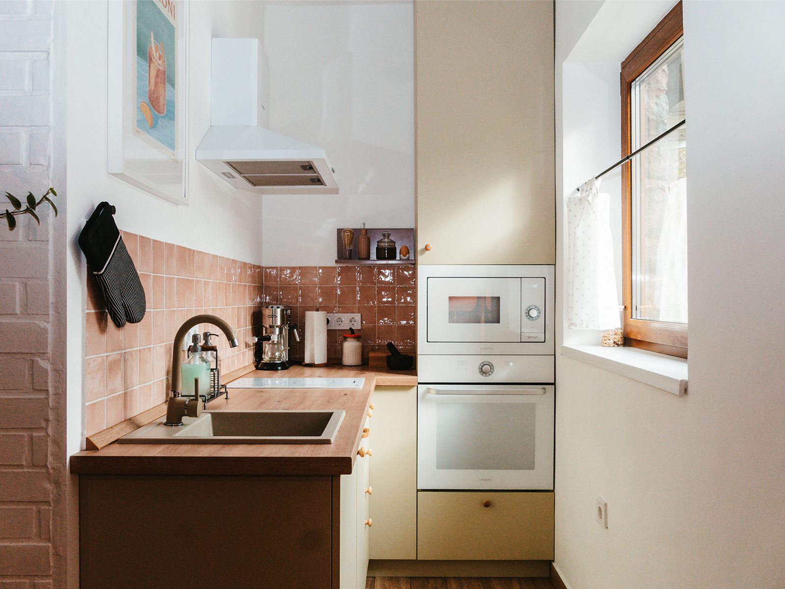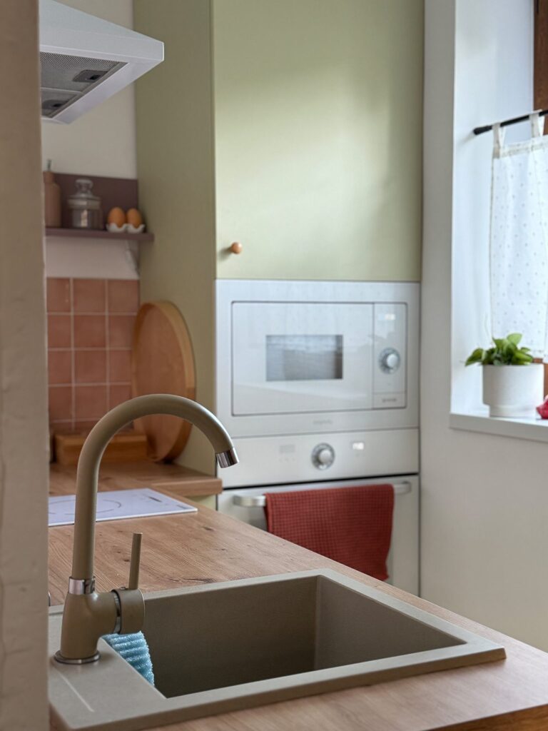 – Gépesített, teljesen felszerelt konyha: beépített mikró, sütő és mosogatógép (mosogatószert és a gépbe helyezhető tablettát is biztosítunk), indukciós főzőlap, fagyasztós hűtő, kenyérpirító, kávéfőző, bekészített őrölt kávé, tea többféle ízben, egyéb: edények, tányérok, poharak, evőeszközök, alap élelmiszerek: liszt, rizs, cukor, olaj, só, fűszerek