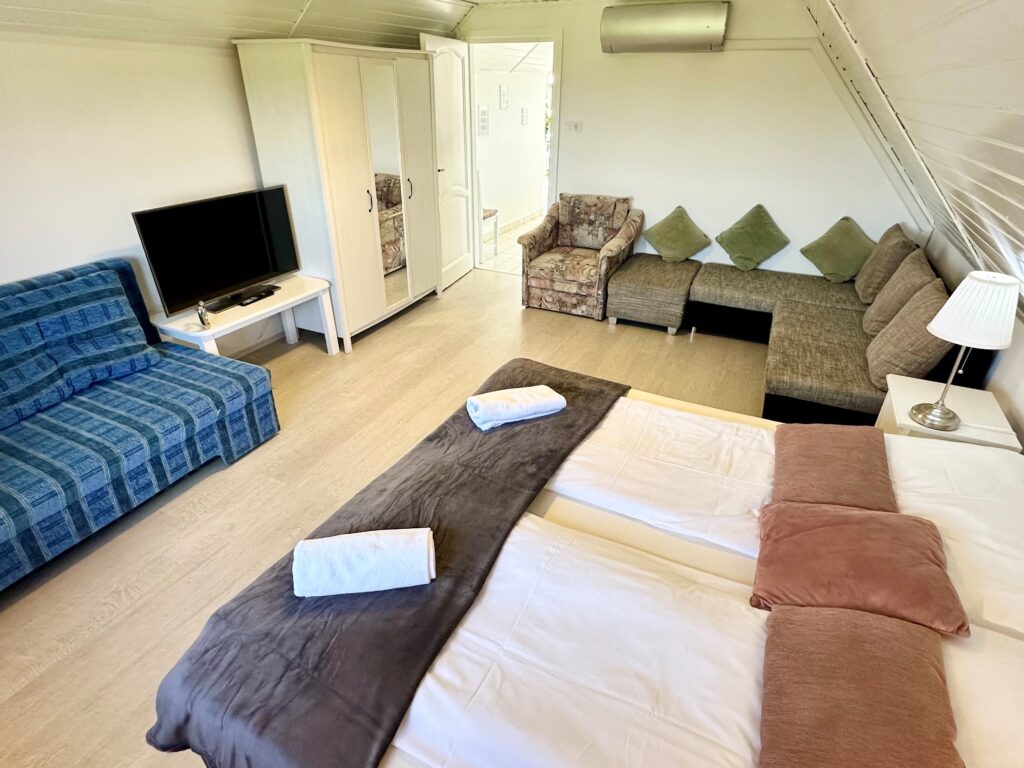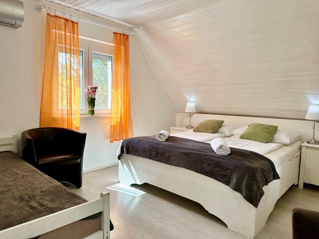 A földszinti jobb oldali és bal oldali apartman 2-3-4 fő elhelyezésére alkalmas, míg az emeleti két hálószobás apartmanban 4-6-7 főt tudunk elszállásolni. Így a Szent Orbán Panzióban 15 fő vendéget tudunk egyidejűleg fogadni.