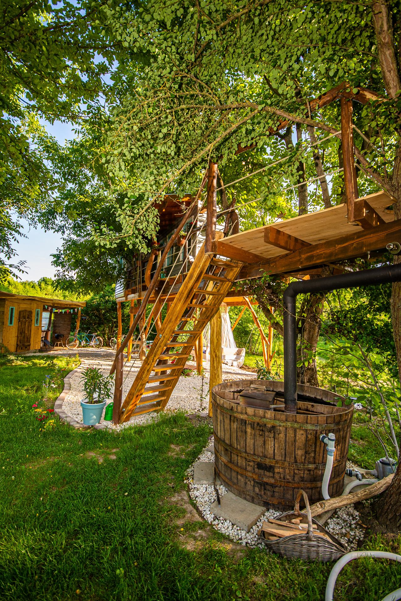 Lombházainkat több nagy diófára építetettük fel, 3 – 3.5 méter magasan. A két lombház, az Árnyas Dió és a Nászház a Fán egymás melletti területen, de nem átlátható módon épült fel a fákra. A lombok ölelésében még a nyári melegben is élvezhetitek az árnyékot nyújtó teraszt 25 m2-en. Az udvaron fatüzelésű, 5 illetve 2 személyes dézsafürdő vár télen – nyáron, melyhez egész évben biztosítjuk a tüzifát, ráadásul felár nélkül igénybe vehető.