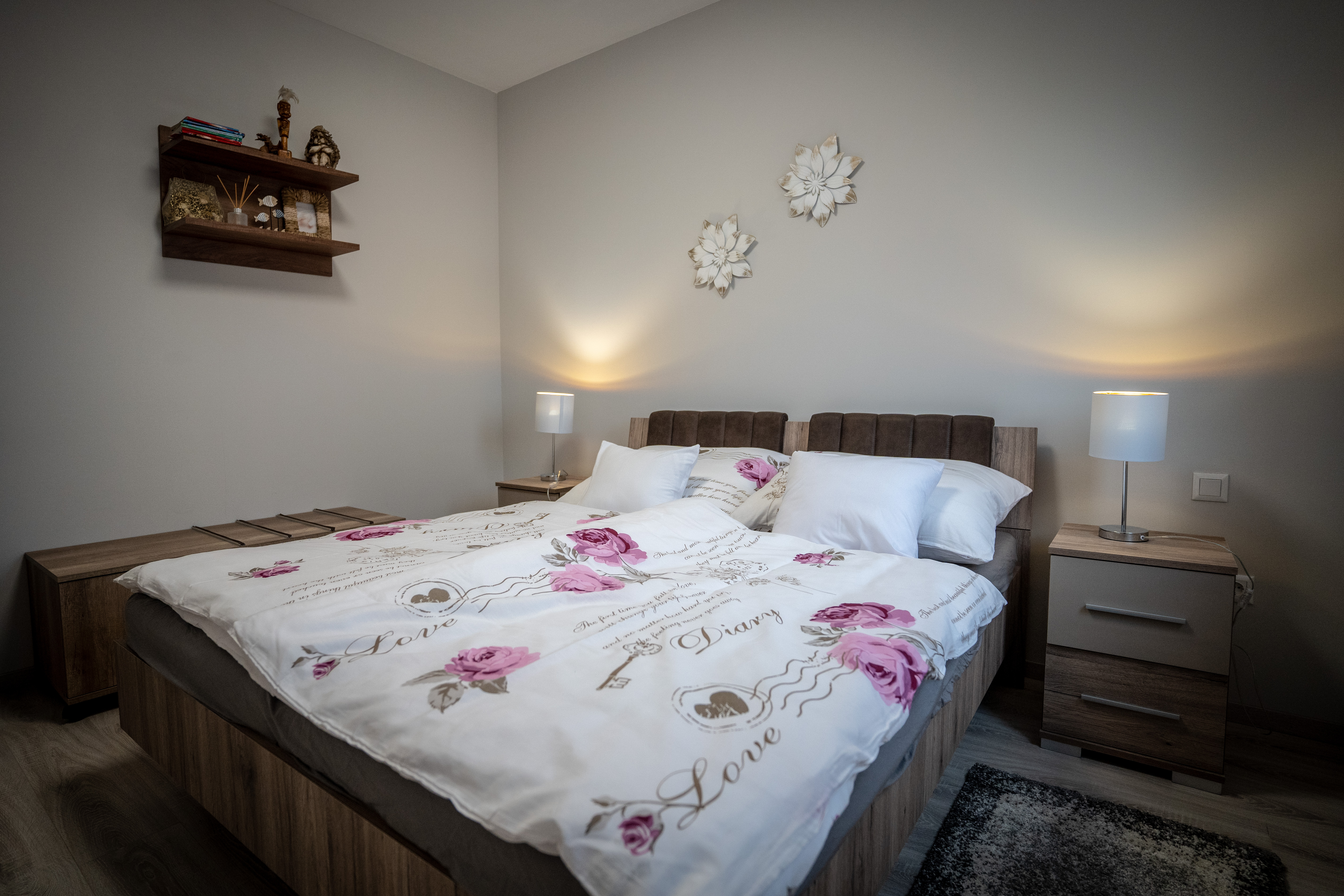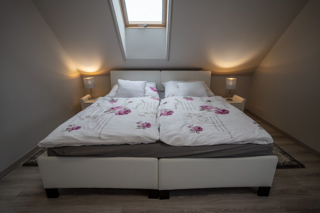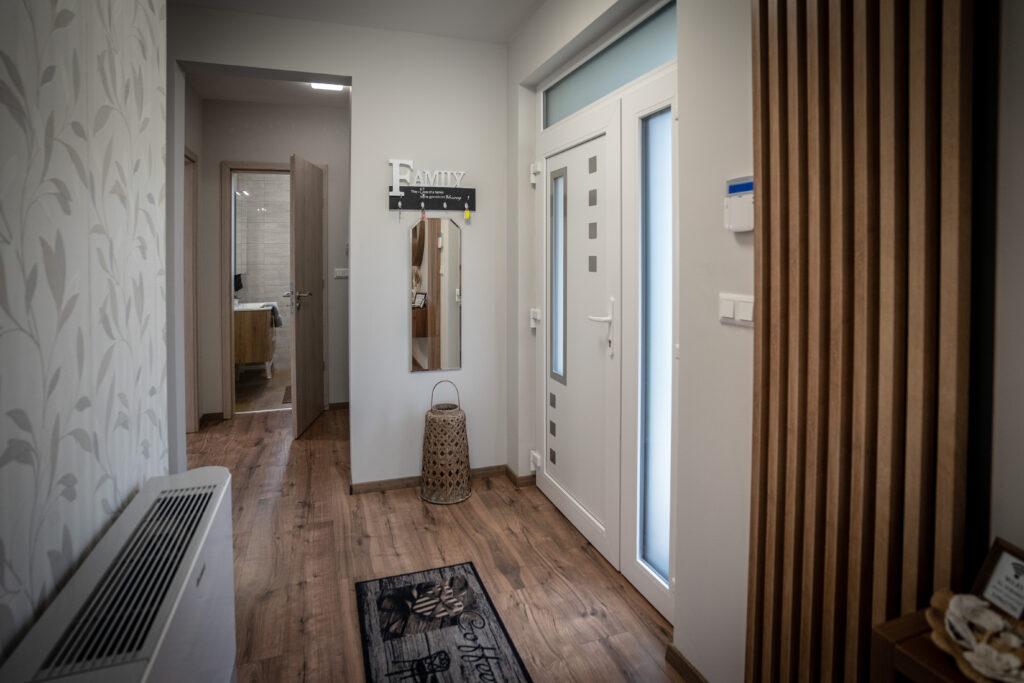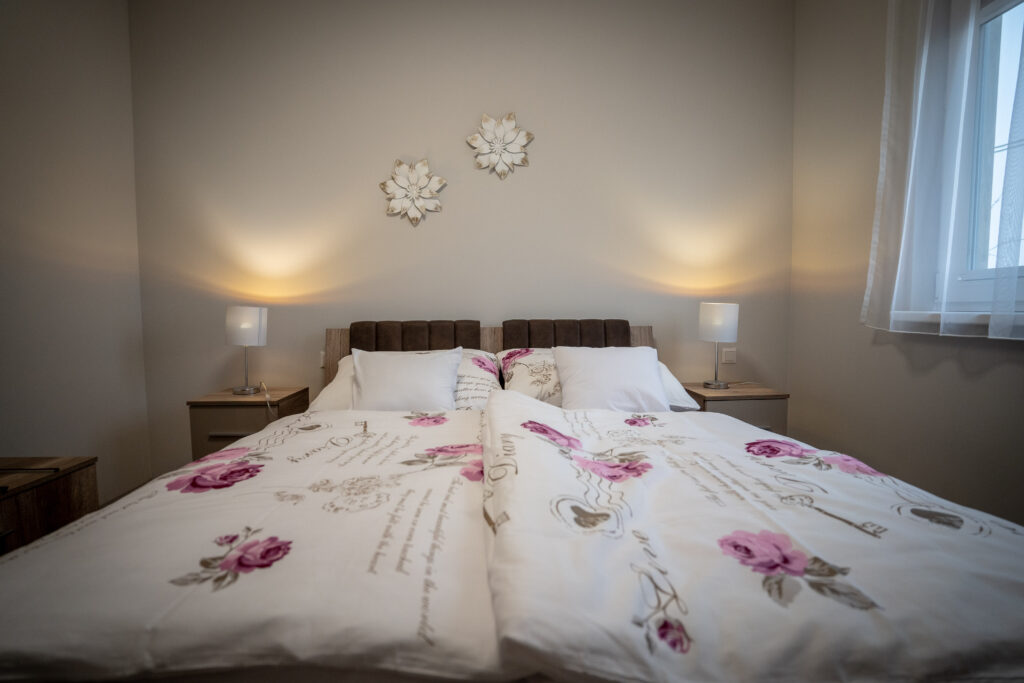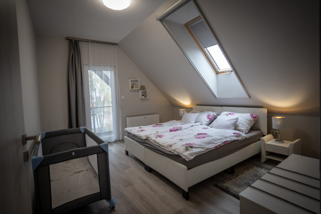 Az apartman alsó szintjén helyet kapott egy hálószoba udvarra néző kilátással, egy zuhanyzós fürdőszoba mosdóval egyben, valamint Vendégeink részére itt tartózkodás alatt is rendelkezésre álló tárolóhelység.