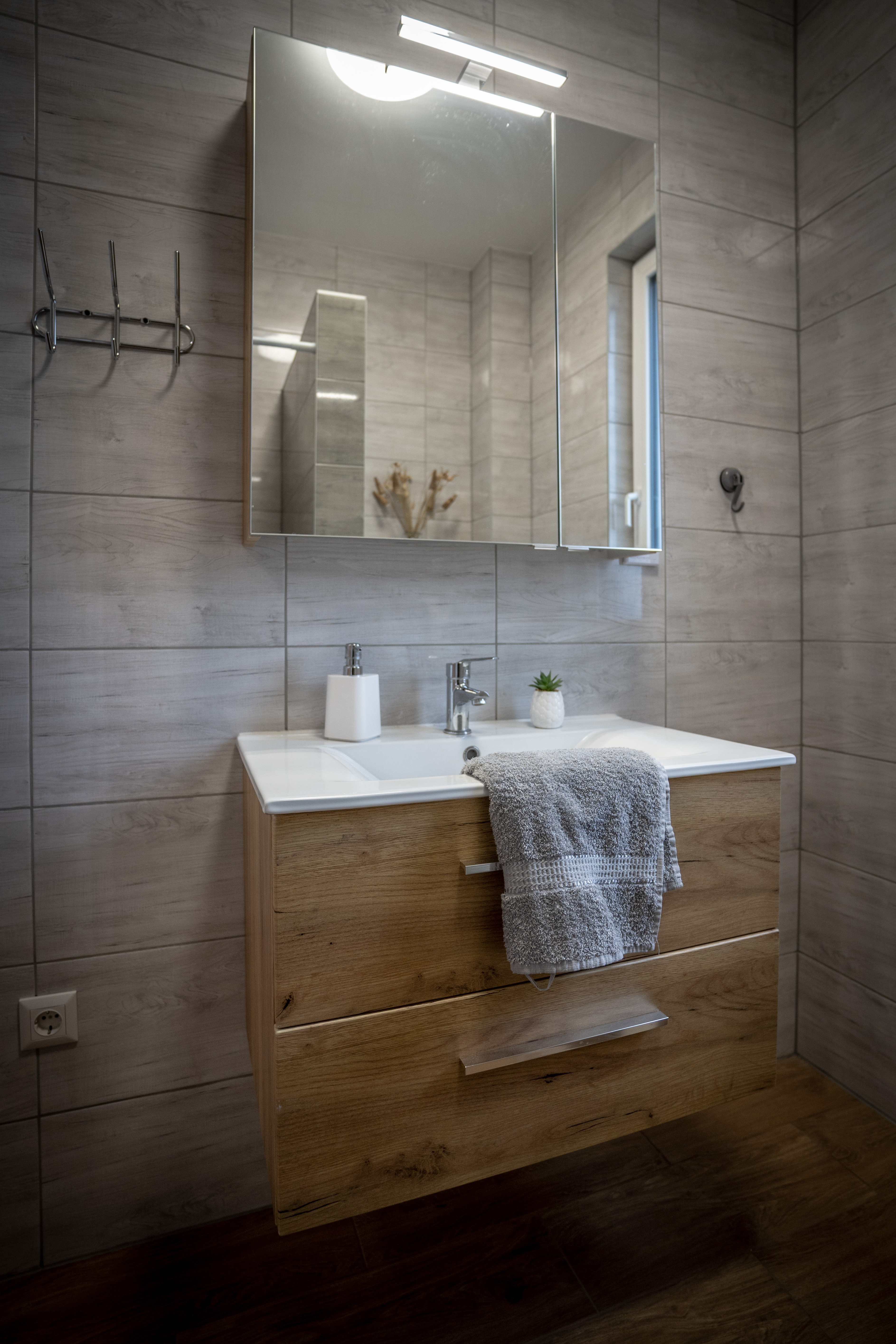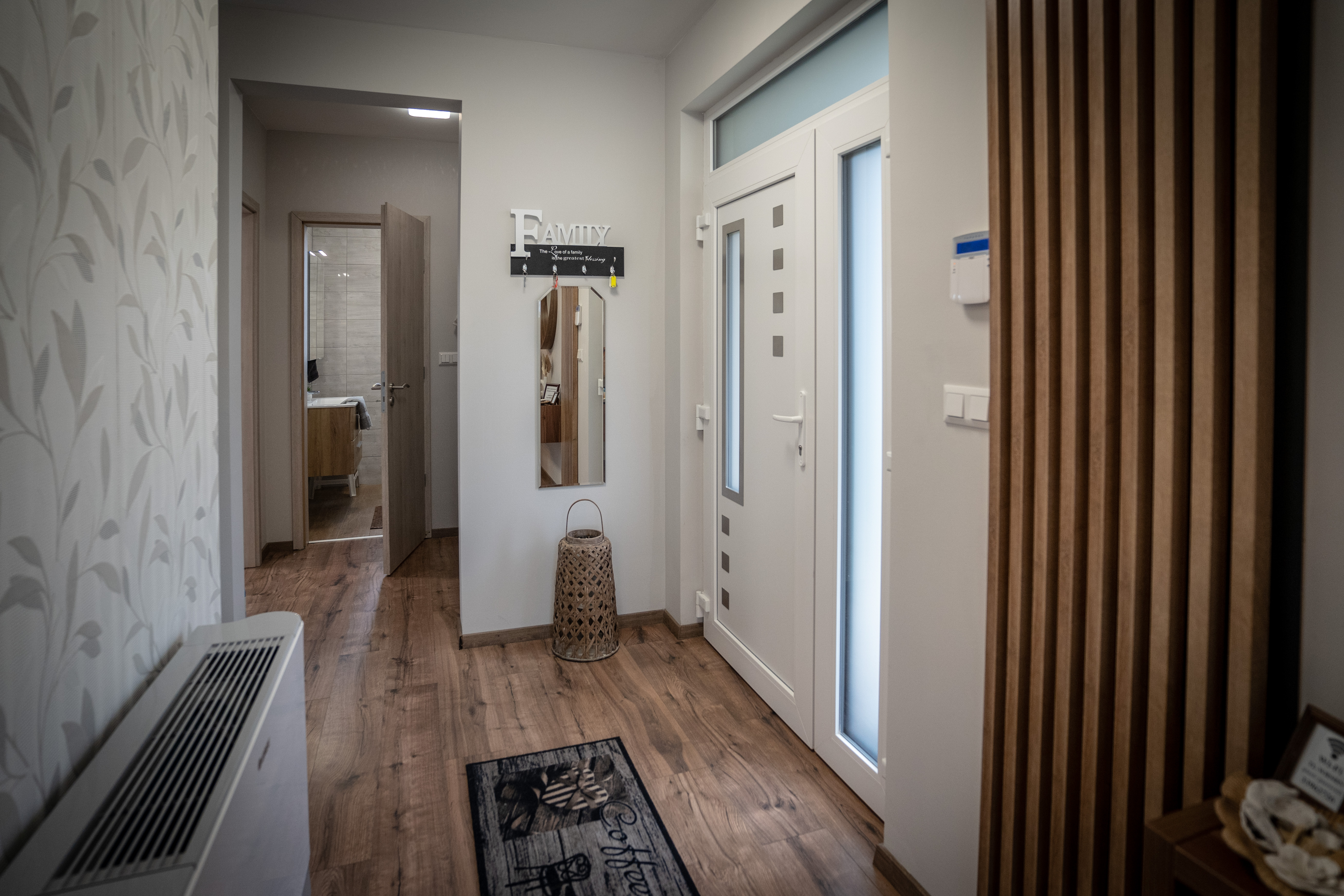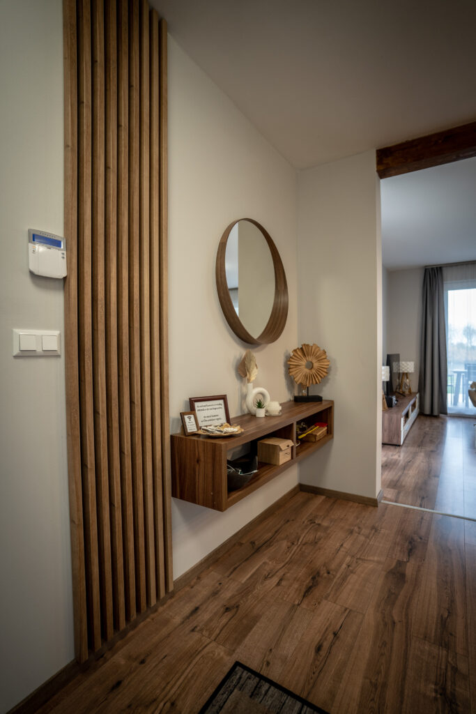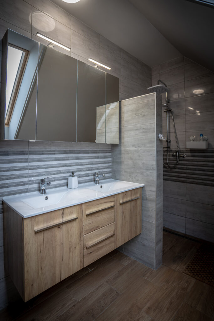 Az apartman alsó szintjén helyet kapott egy hálószoba udvarra néző kilátással, egy zuhanyzós fürdőszoba mosdóval egyben, valamint Vendégeink részére itt tartózkodás alatt is rendelkezésre álló tárolóhelység.