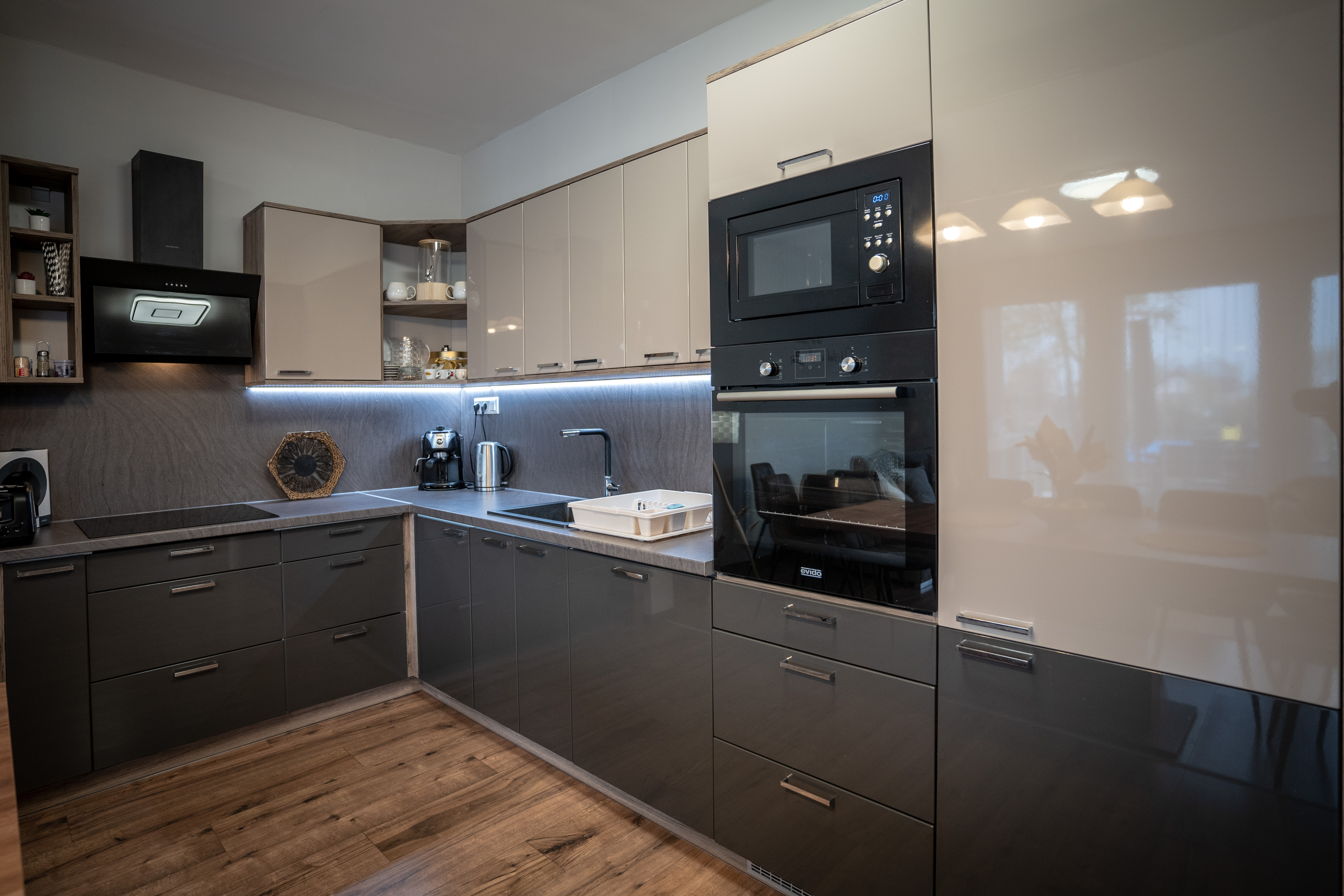 Vendégeink részére az igényes konyha teljes felszereltséggel áll rendelkezésre /mikrohullámú sütő, kenyérpirító, vízforraló, hűtőszekrény,fagyasztó, mosogatógép, edények, étkészlet, evőeszköz stb./