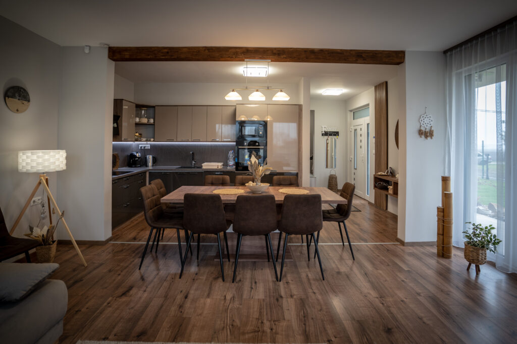 A szintes nyaraló 8+2 fő elhelyezésére alkalmas, újonnan épült ,szigetelt, fan-coil fűtéssel-hűtéssel és minden extrával felszerelt apartman , otthonosan berendezve összesen 120 m2 alapterületen , melynek alsó szintjén kedves Vendégfogadóból egy gyönyörű, világos nappali étkező, konyha tárul elénk Körösre néző panorámával. Nagyobb társaságok, családok részére tágas közösségi tér.