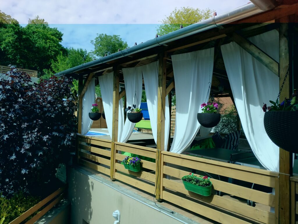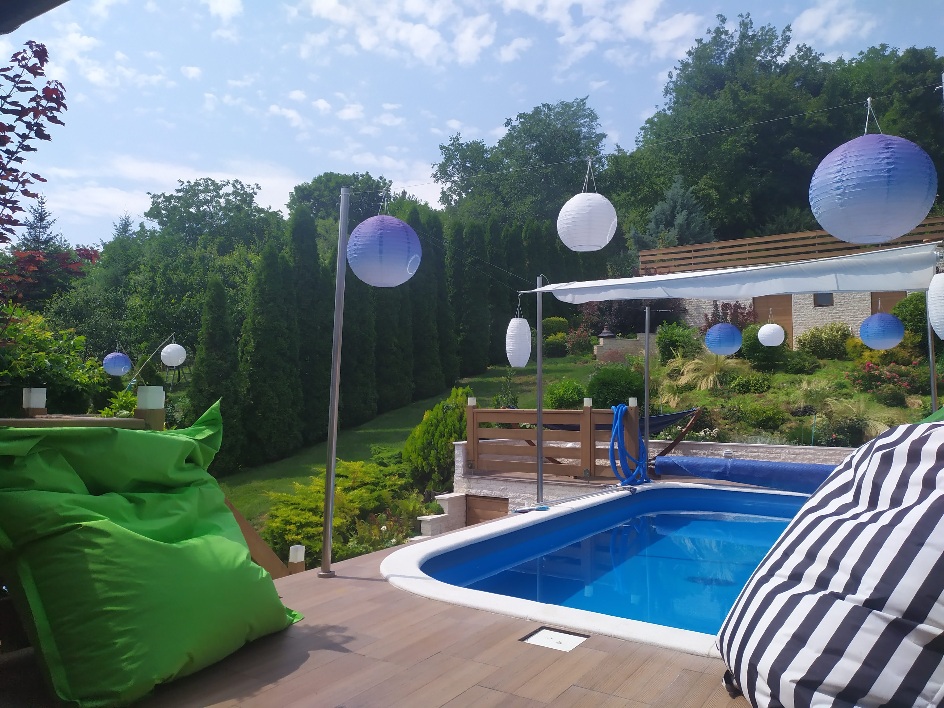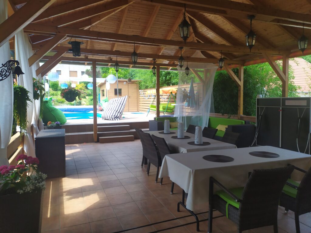 Csodás nagyméretű fedett terasz, genesis tipusú grillezési lehetőséggel, ping-pong asztallal, nagyméretű rattan étkező- és sarok pihenő garnitúrával, hintaággyal, színes babzsákokkal.