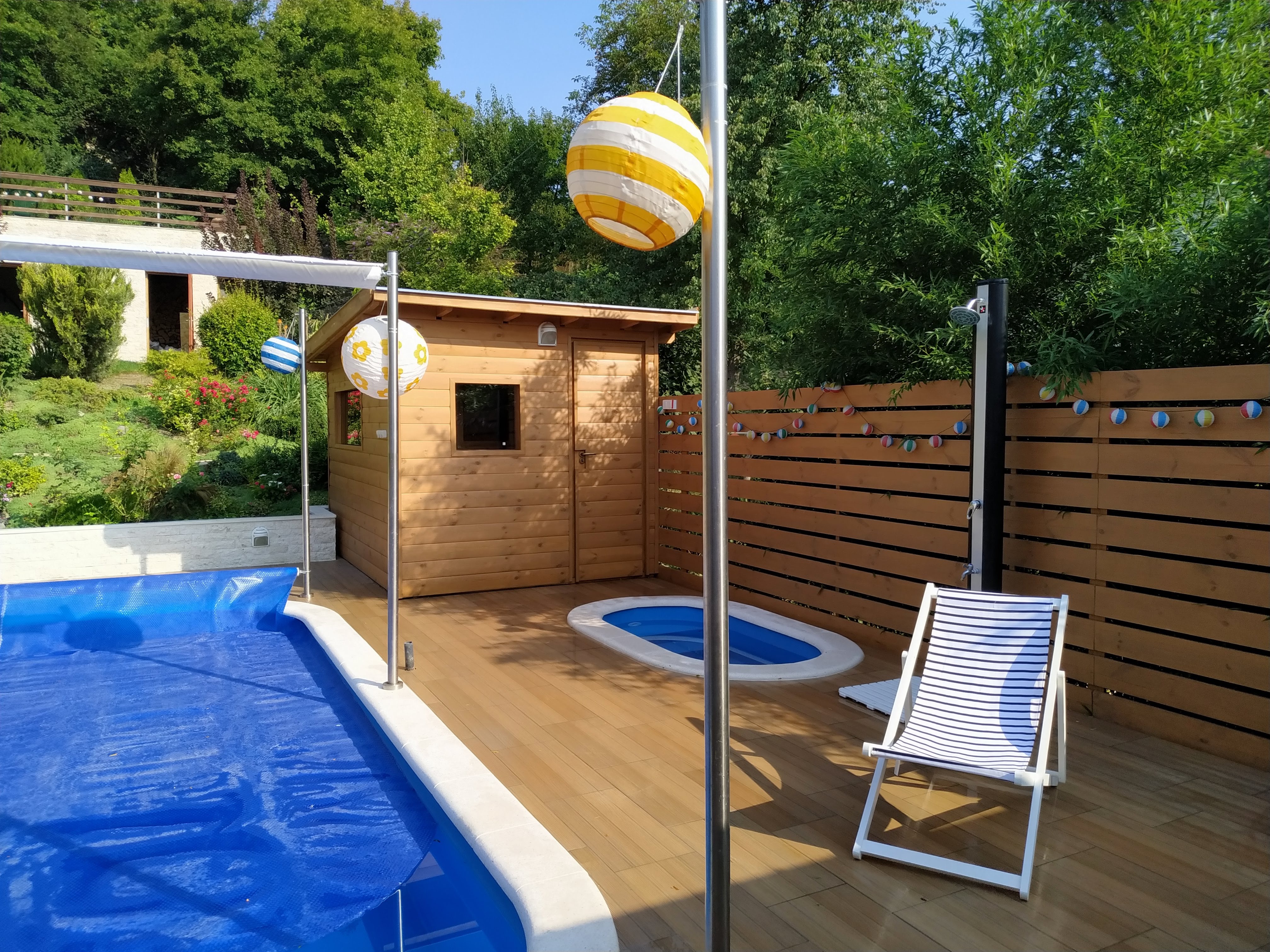 Wellness terasz: vadonatúj 6 személyes JAKUZZI, finn szauna, 2 kivilágított medence, az egyik nyáron FŰTÖTT! a másik hideg vizes csobbanóként üzemel, egész évben!
