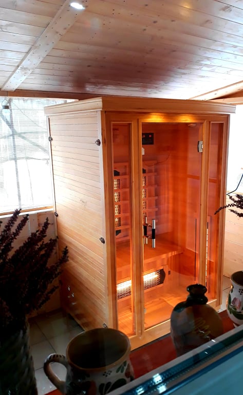 Egész évben üzemelő fűthető dézsa jakuzzi, szauna, tavasztól medence, gyermek élménymedence.