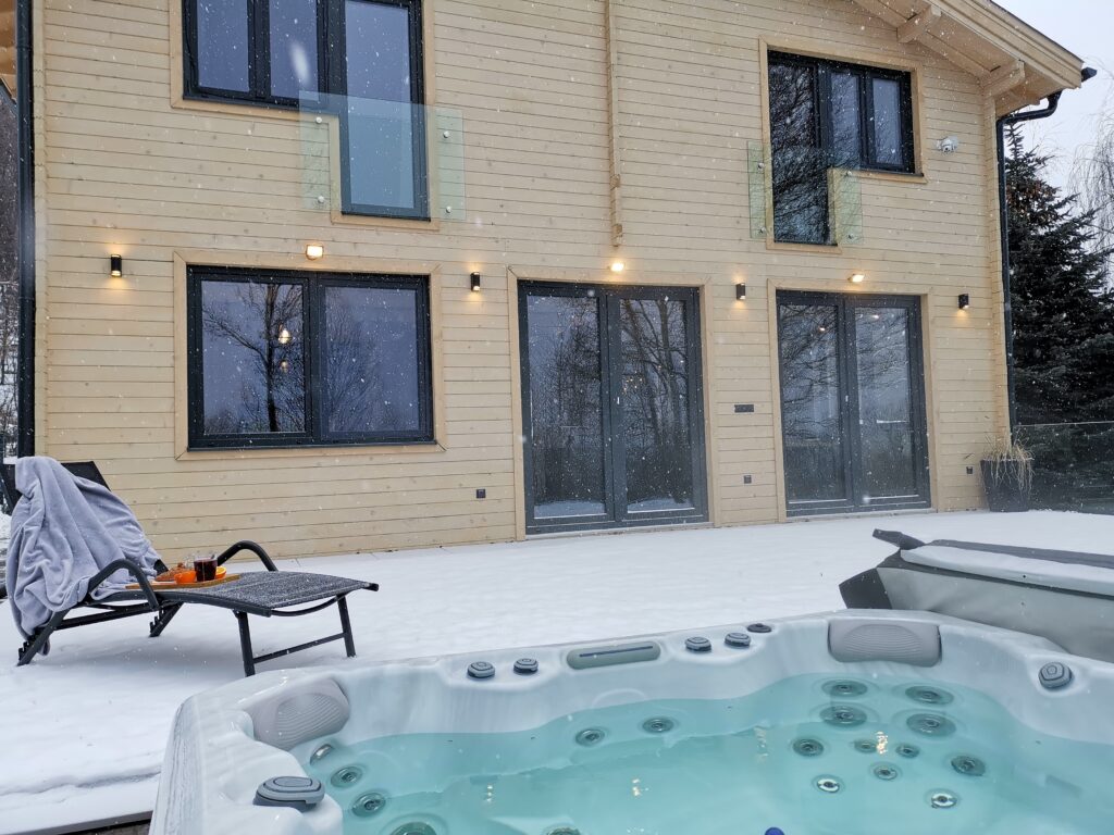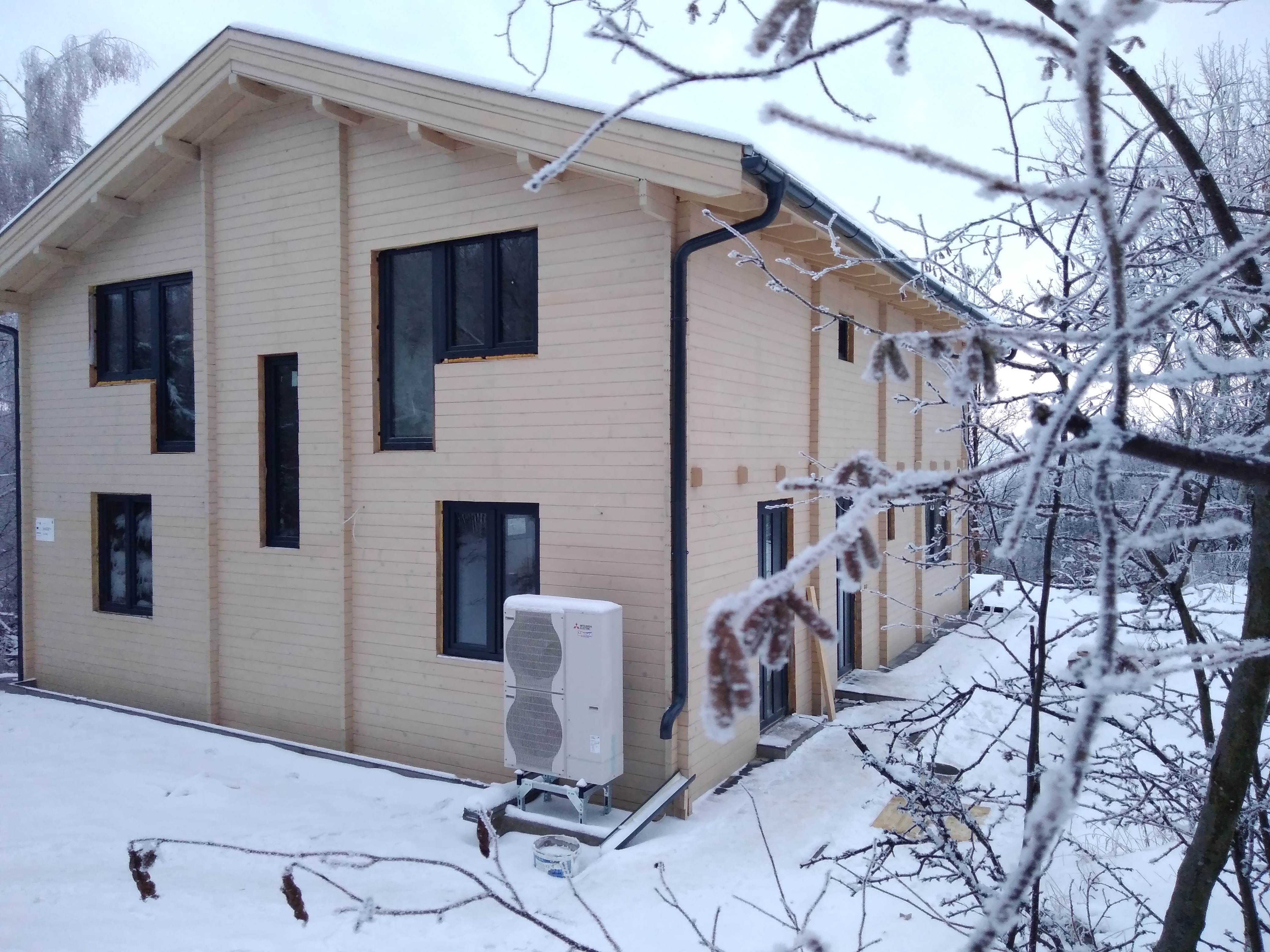 A hagyományos technológiával épült modern gerendaház két szintes.
