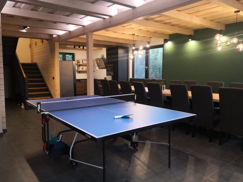 A hatalmas közösségi térben még a pingpong asztal is elfér. A felső szinten kapott helyet a 4 db fürdőszobás szoba.