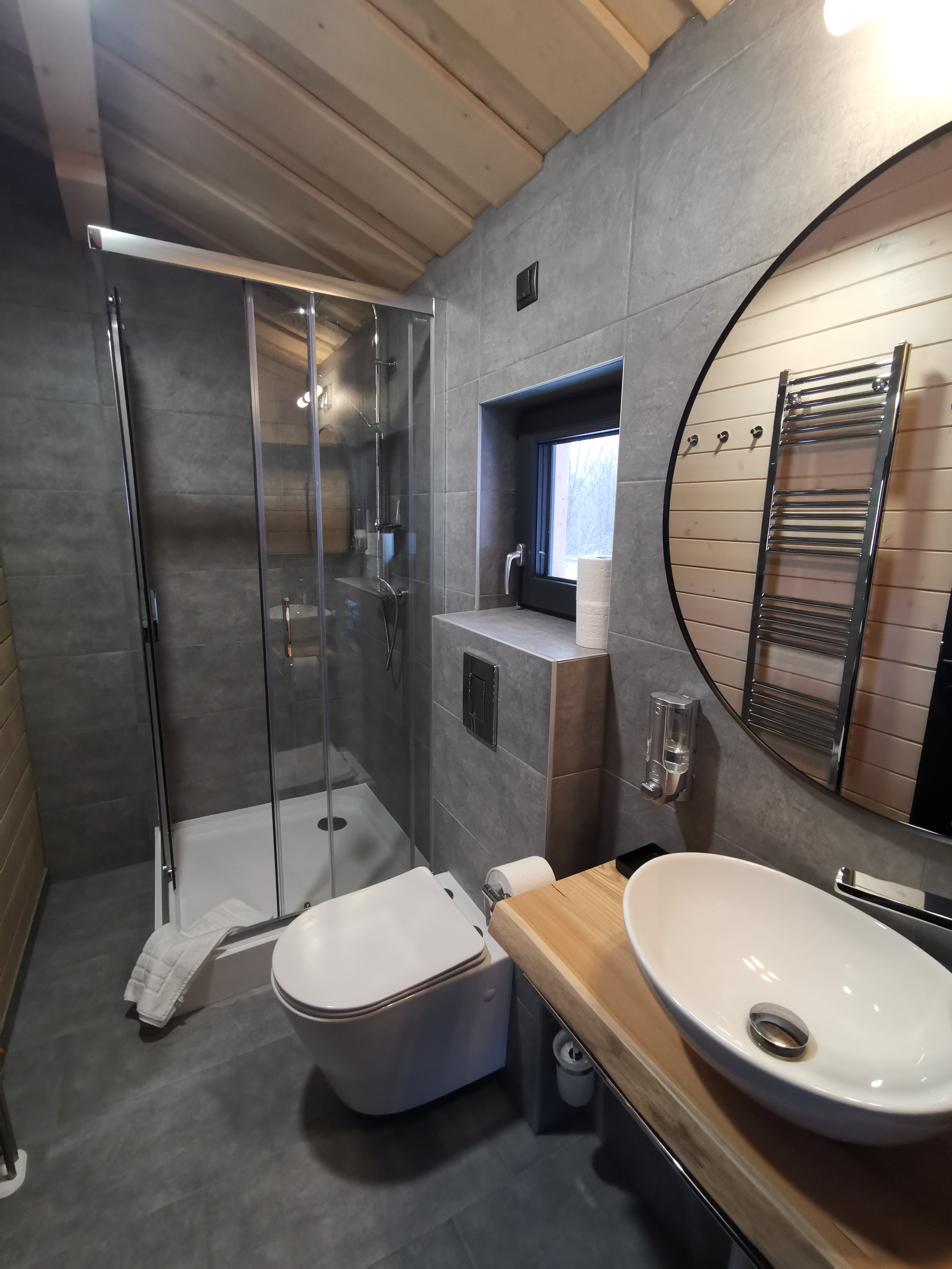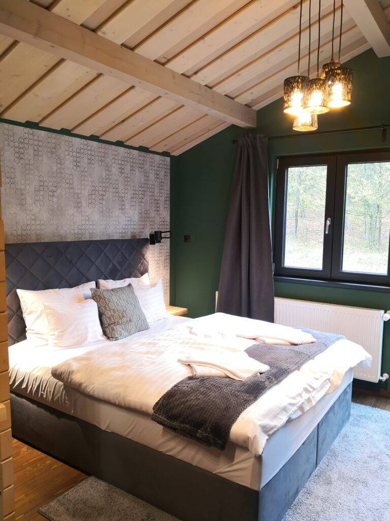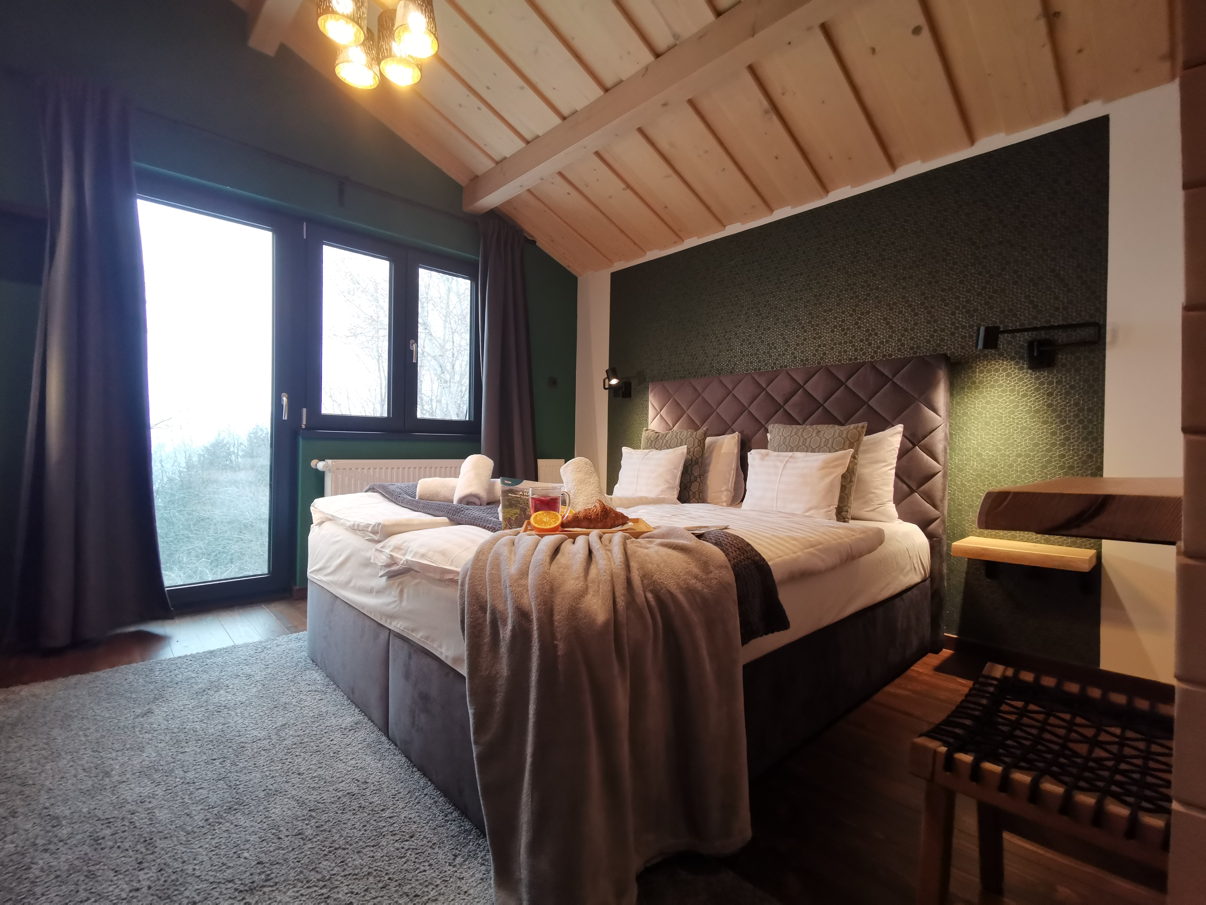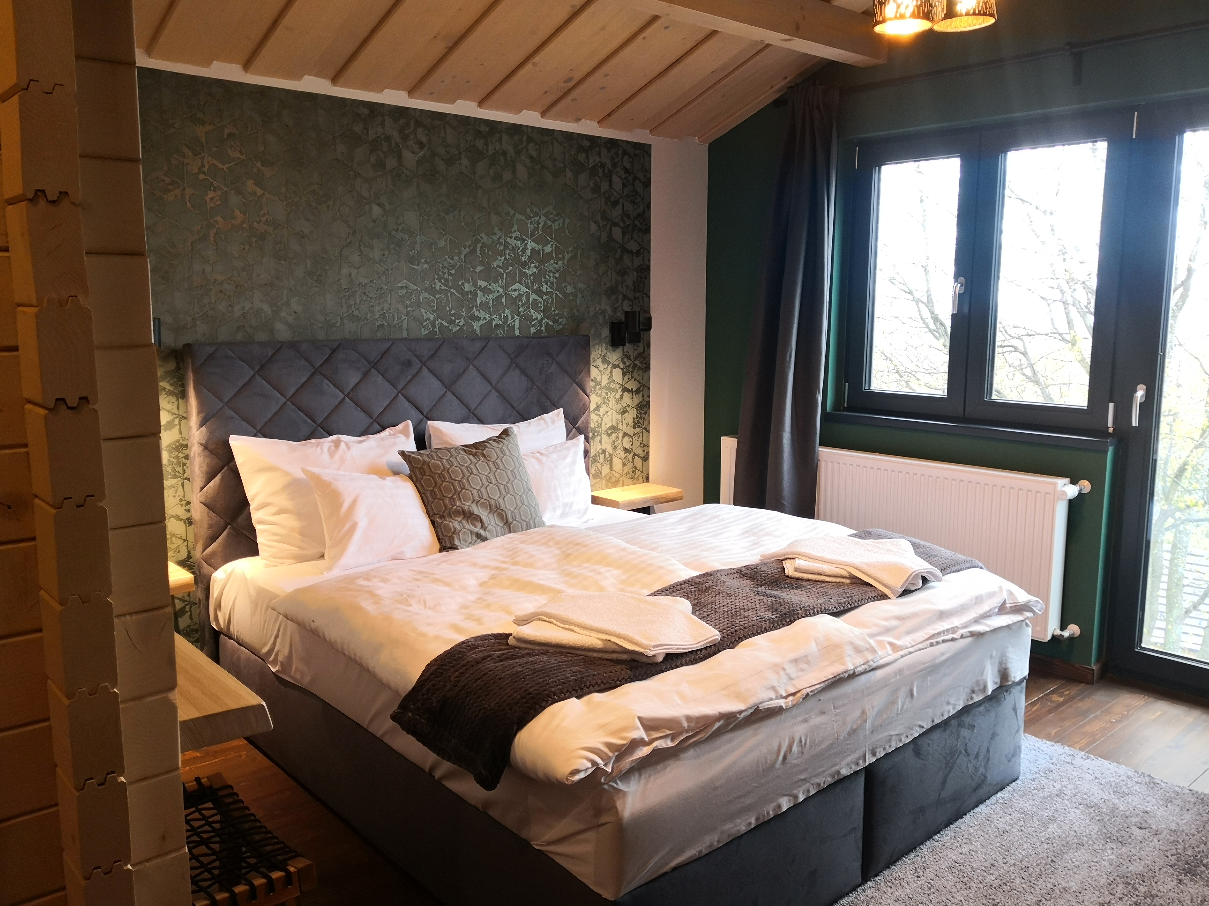Minden szobában boxspring franciaágy, emeletes ágy normál méretű, vastag matracokkal akár felnőtteknek is és egy pótágy vagy babaágy elhelyezése is lehetséges. Minden szoba franciaerkélyes, üvegkorláttal, erdei panorámával. Az alsó szintről hatalmas panorámaajtókon keresztül kijárat az óriási üvegkorlátos teraszra, ami jó idő esetén a társasági élet színtere és innen beléphetünk a 6 személyes jakuzziba is, mely télen-nyáron vendégeink rendelkezésére áll.