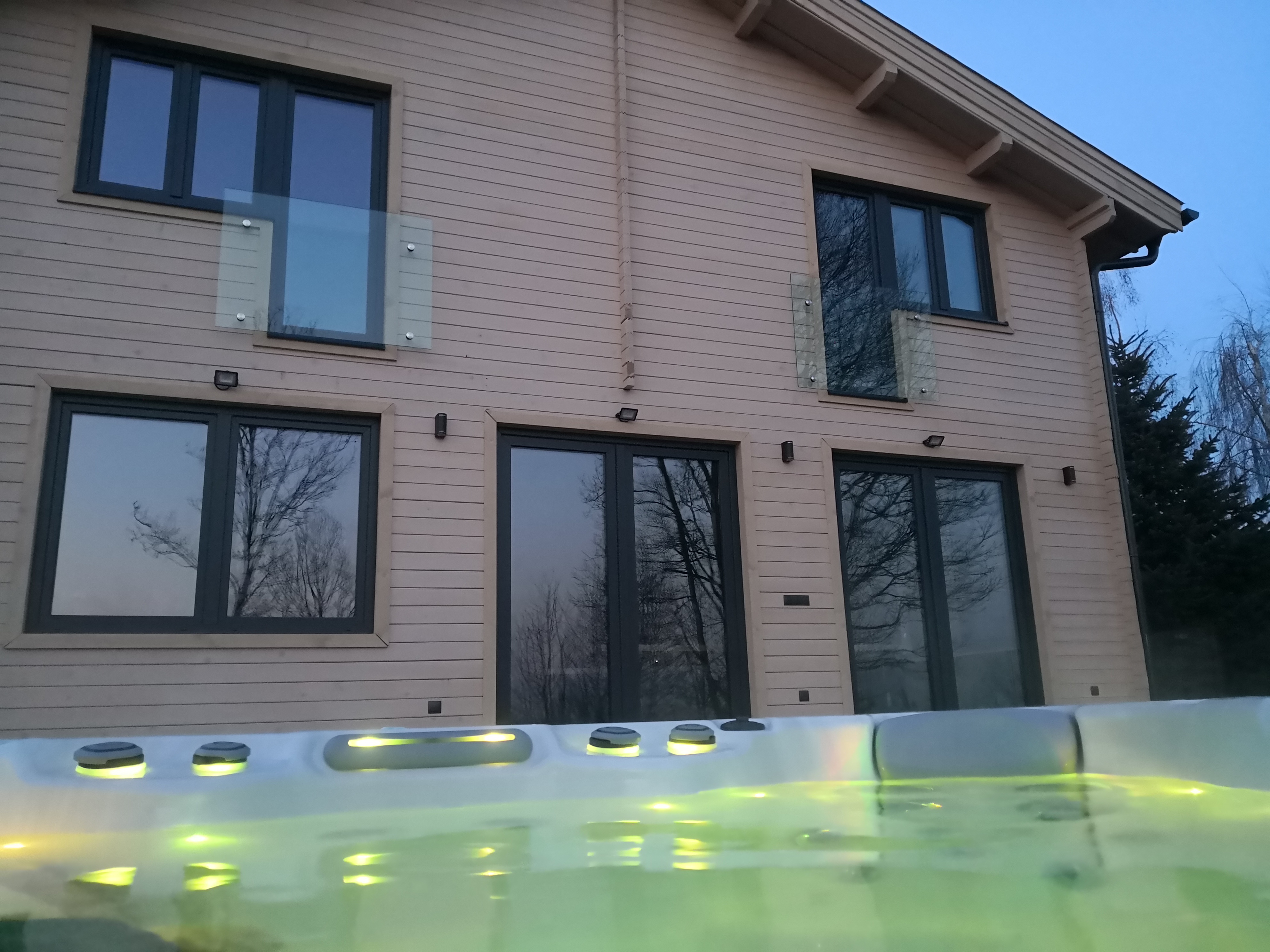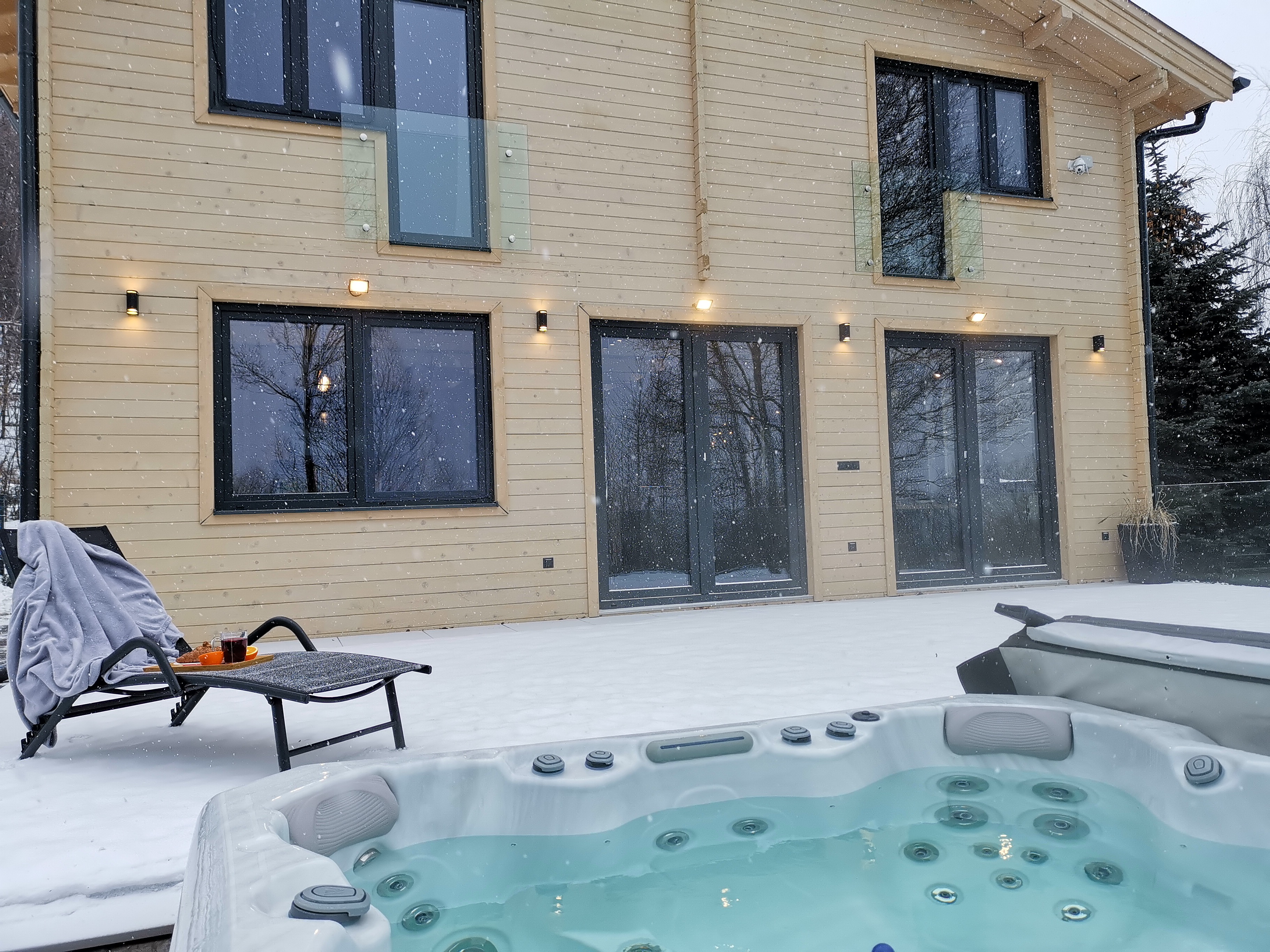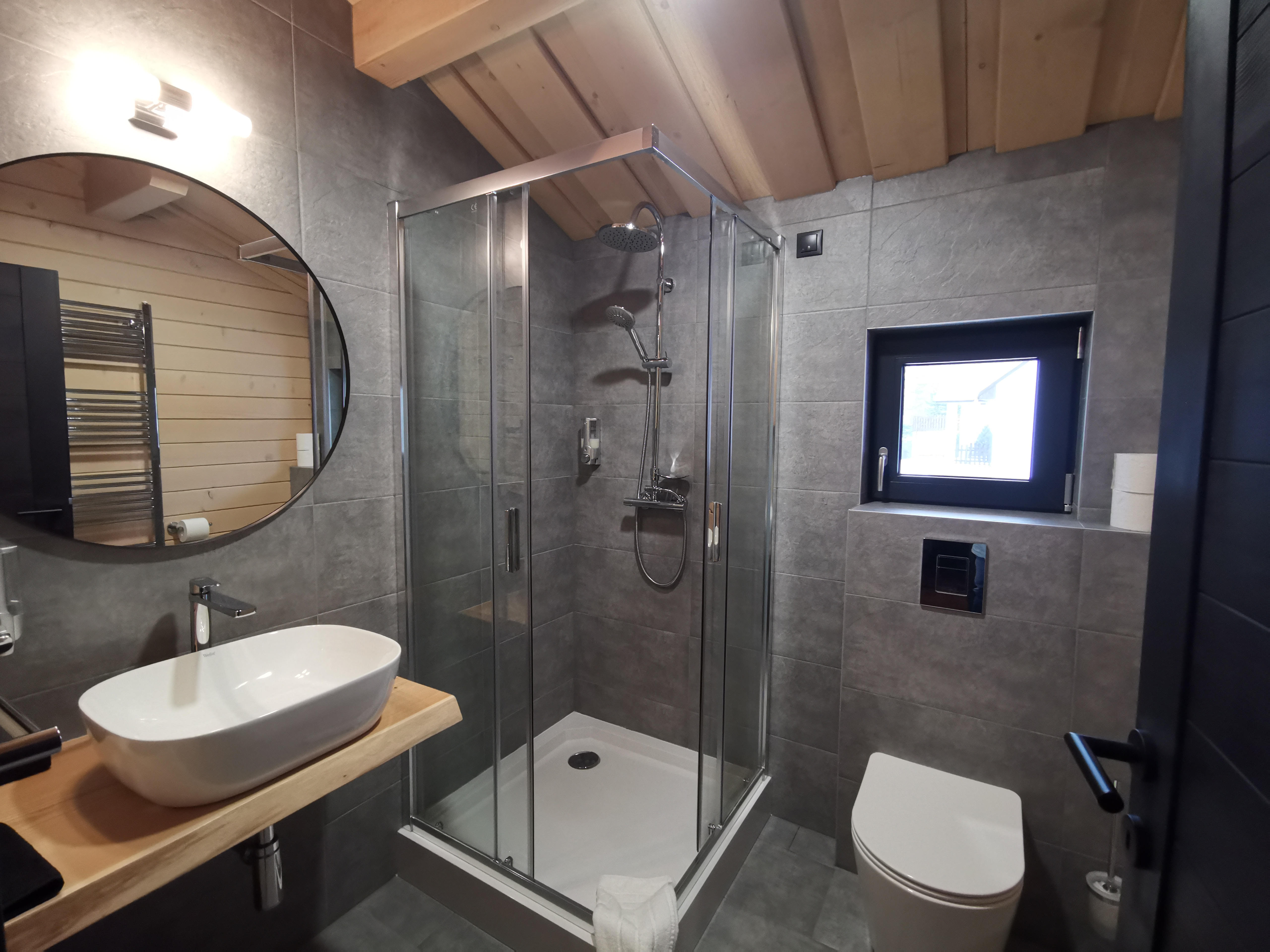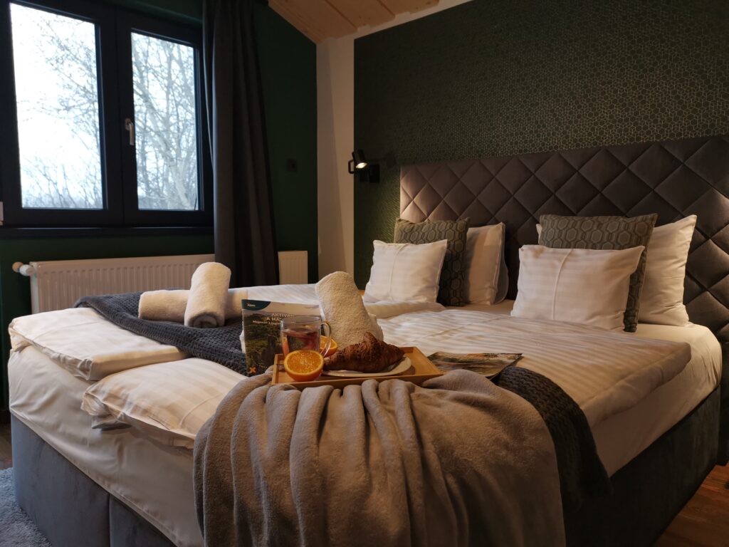 Minden szobában boxspring franciaágy, emeletes ágy normál méretű, vastag matracokkal akár felnőtteknek is és egy pótágy vagy babaágy elhelyezése is lehetséges. Minden szoba franciaerkélyes, üvegkorláttal, erdei panorámával. Az alsó szintről hatalmas panorámaajtókon keresztül kijárat az óriási üvegkorlátos teraszra, ami jó idő esetén a társasági élet színtere és innen beléphetünk a 6 személyes jakuzziba is, mely télen-nyáron vendégeink rendelkezésére áll.