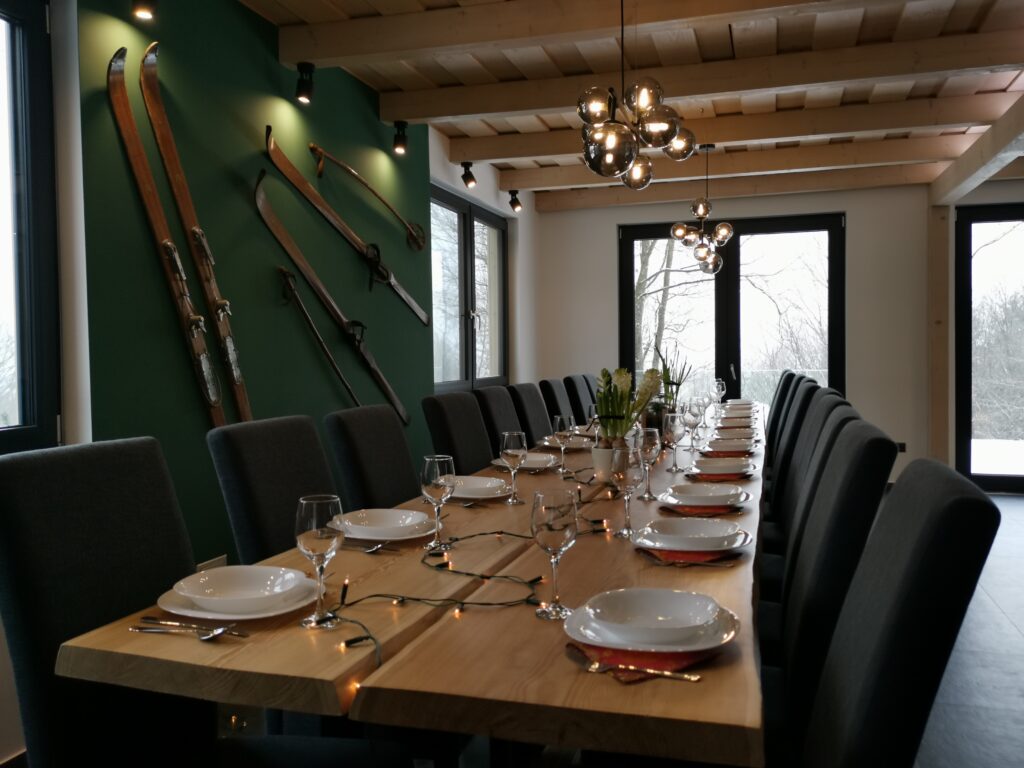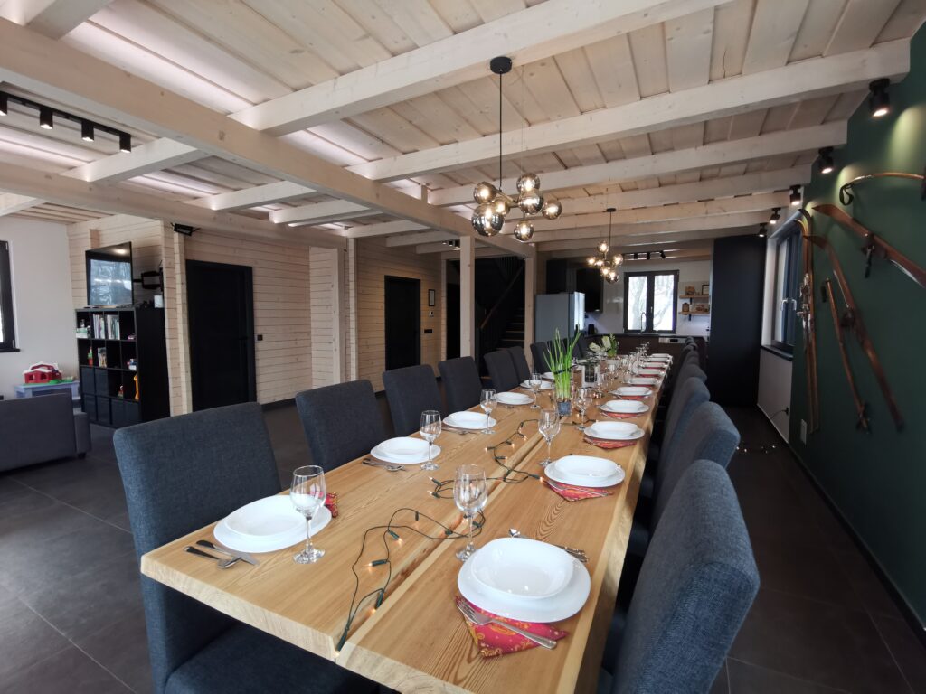 Az alsó szint a közösségi élet színtere: sítárolós előszoba, teljesen felszerelt luxus konyha (mosogatógép, beépített mikró, sütő, indukciós főzőlap, kávéfőzők, kávé bekészítés, vízforraló, teaválogatás, teljes konyhafelszerelés…), 20 személyes, 6 méteres egyedi készítésű tömörfa étkezőasztal kárpitozott székekkel, nappali sarok kanapéval, melyet kinyitva 280×200 cm fekvőfelületet kapunk a kényelmes TV-nézéshez, gyereksarok.